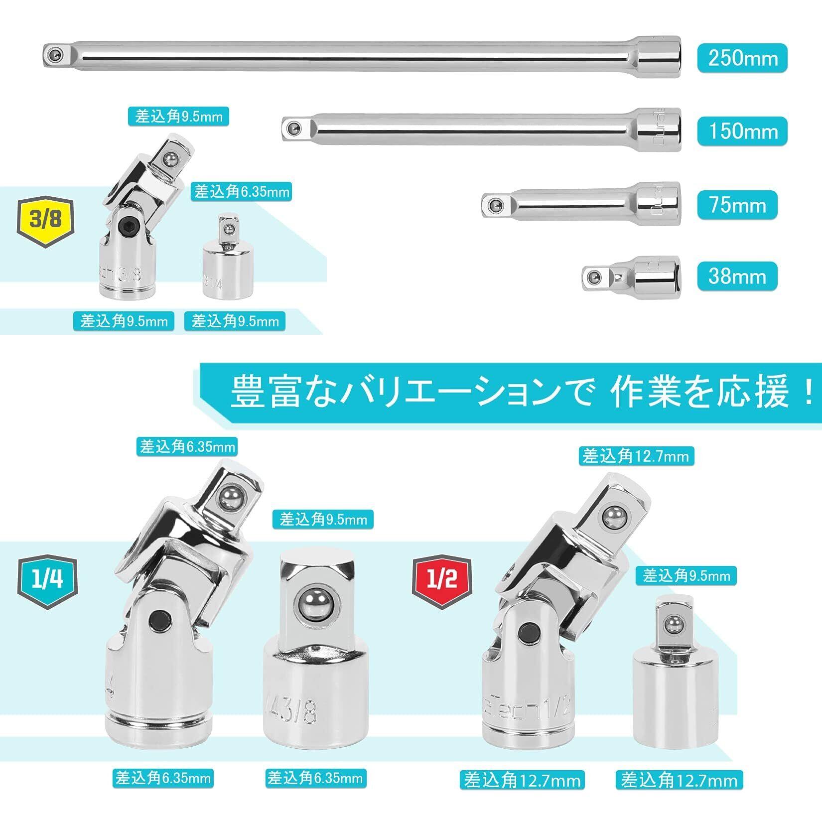 【エクステンションバー】差込角9.5mm、全長38mm/75mm/150mm/250mm各1本。エクステンションバー同士を接続して更に長くする事もできますので、奥まったボルトでもアクセスできます。