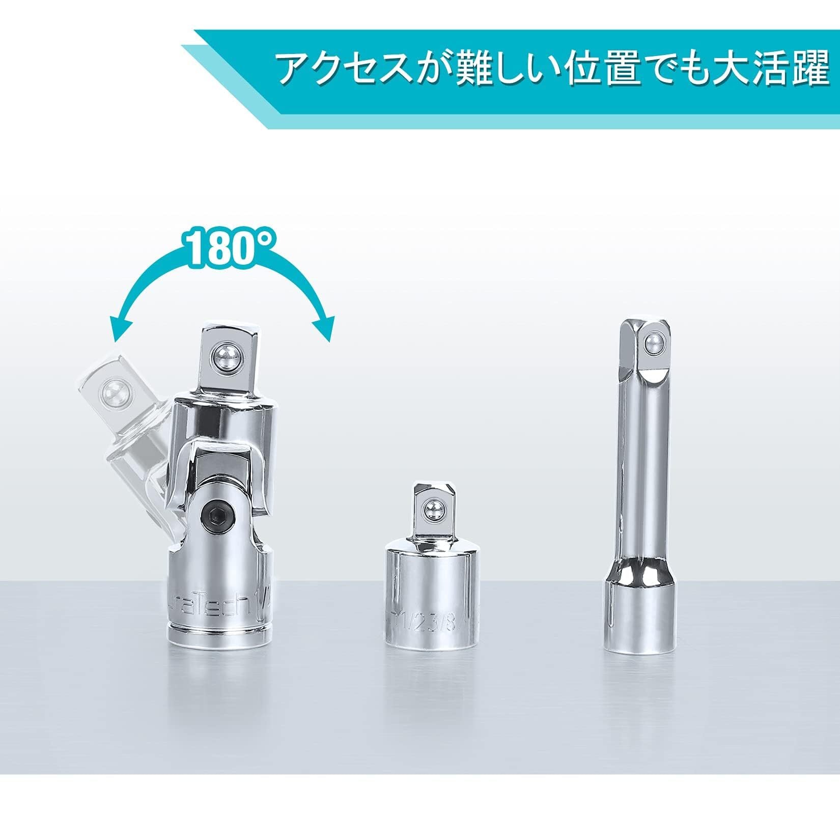 【10点セット】ユニバーサルジョイント3点、エクステンションバー4本、アダプター3点。高品質CR-V鋼製に熱処理&クロムメッキ済みで耐久性に優れていて、車いじりなどの場合、ボルト・ナットの締緩作業をサポートしてくれます。