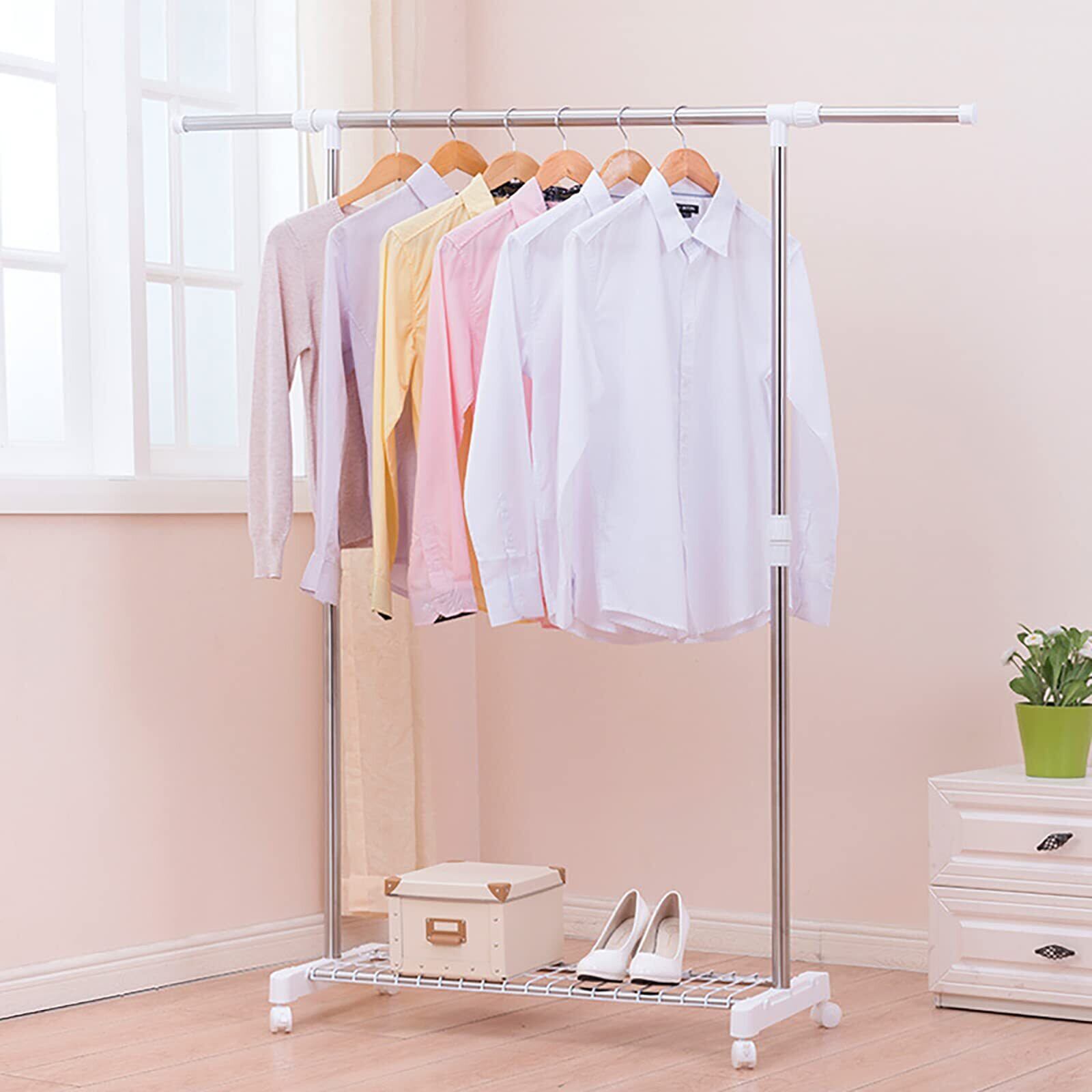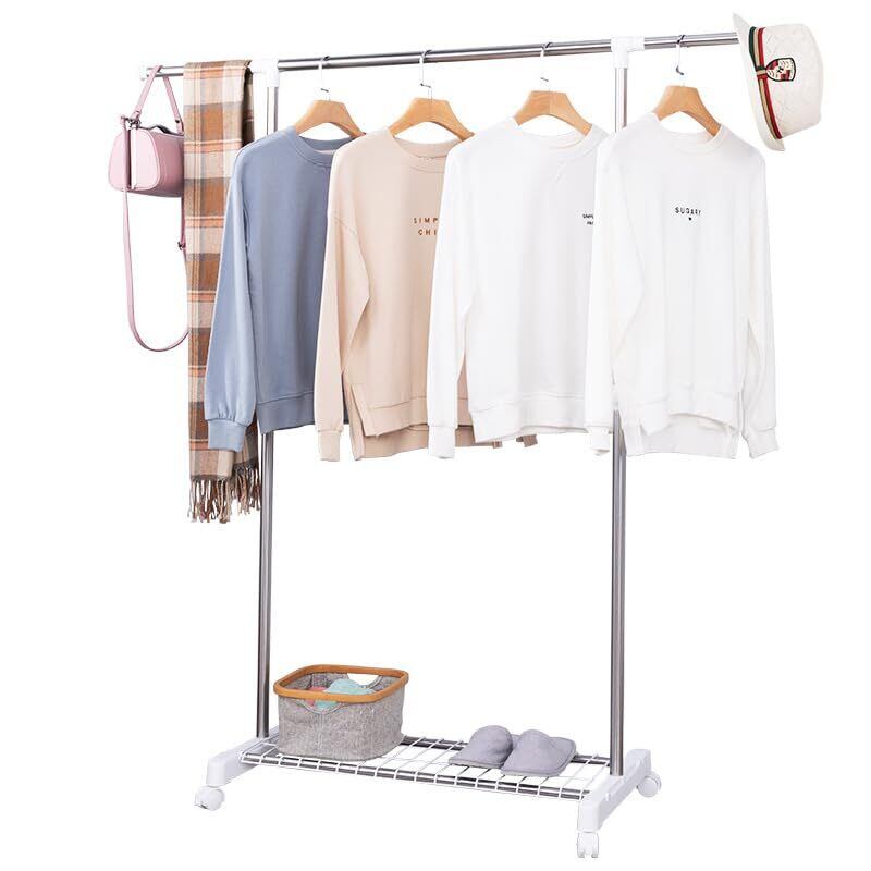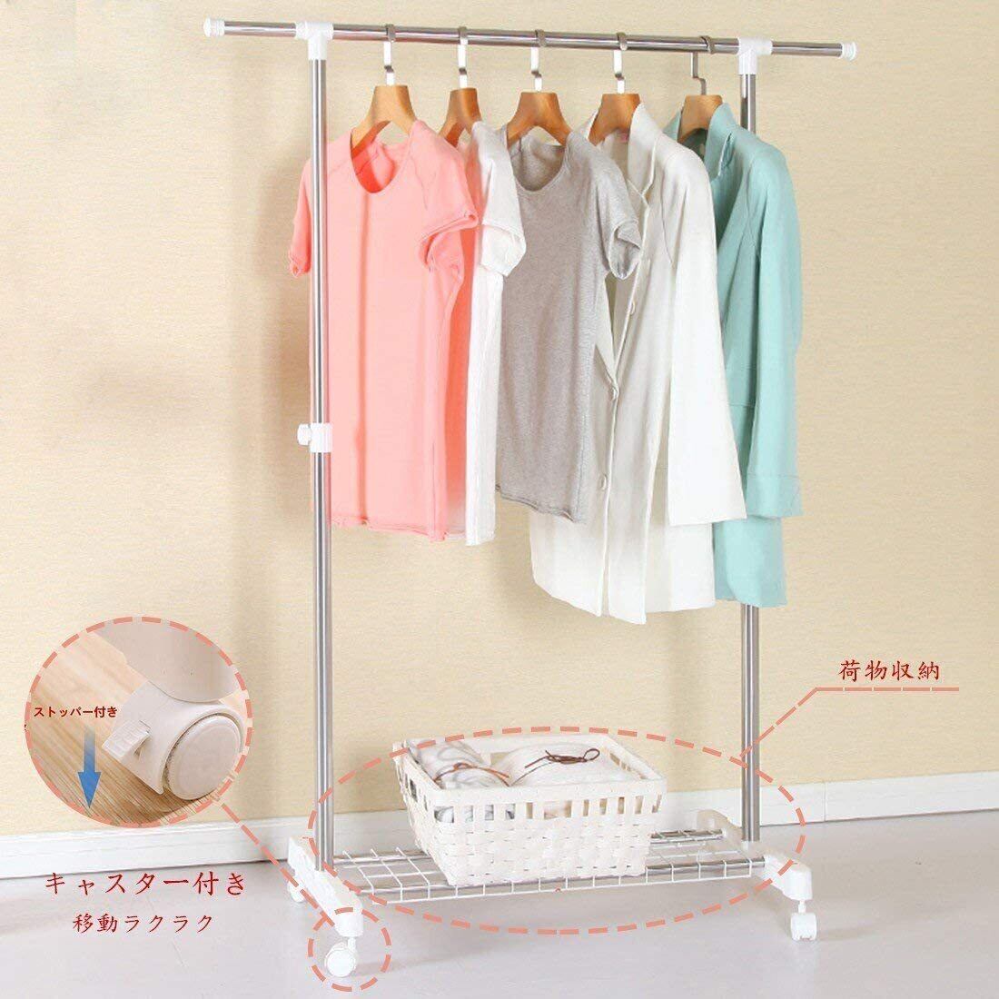 ハンガーラック シングル 洋服ラック キャスター 棚付き Dura-Dry ステンレス パイプハンガー 頑丈 縦横伸縮 幅90~155×奥行43×高さ90~160cm 耐荷重30kg | hananoki