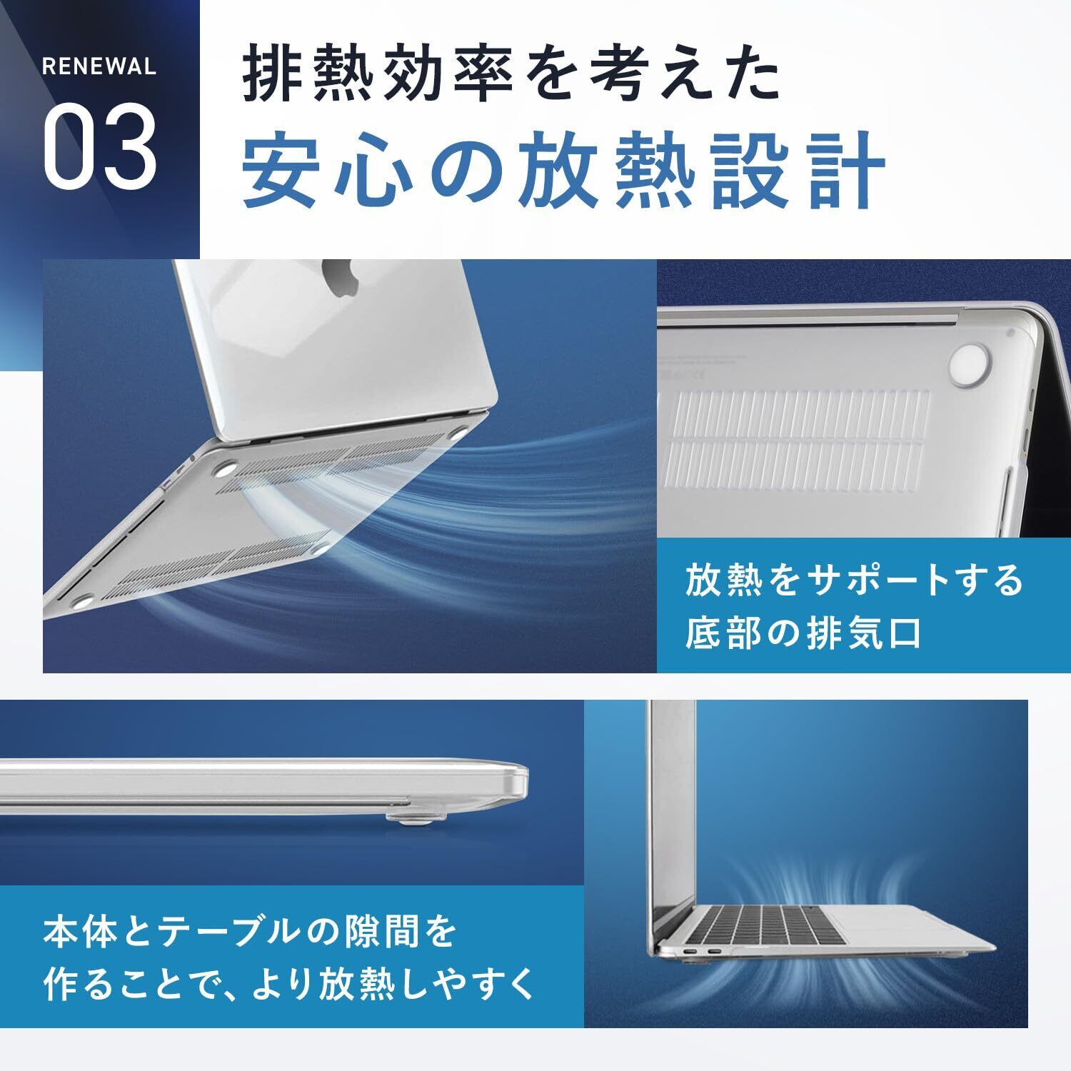 ◆放熱設計底部のカバーには排気口がついているため、通気性がよく、熱を放散してくれます。更に、底部の四隅のゴム足設計により、テーブルとの間に隙間ができ、熱を流しやすくなります。また、ゴム足はテーブルとの摩擦が生じるため、本体が滑るのを防止できます。 超薄軽量、装着簡単上下カバー分離しており、単体使用が可能。機体にぴったり合わせて、取り付けや取り外しも簡単に操作できます。何度開閉してもMacBook本体の邪魔にならず、まるで何もつけてないかのように、薄くて軽く、持ち運びしやすいので、負担になりません。