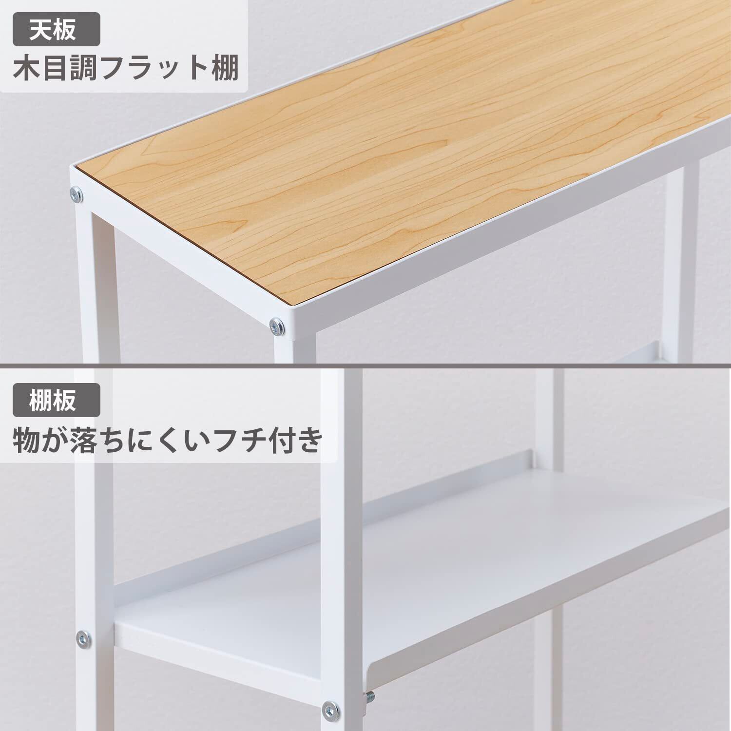 木目調のフラットな棚板とマットな質感の角パイプでインテリア性の高いデザイン。リビングやキッチンの小物の収納棚としても便利に使える。