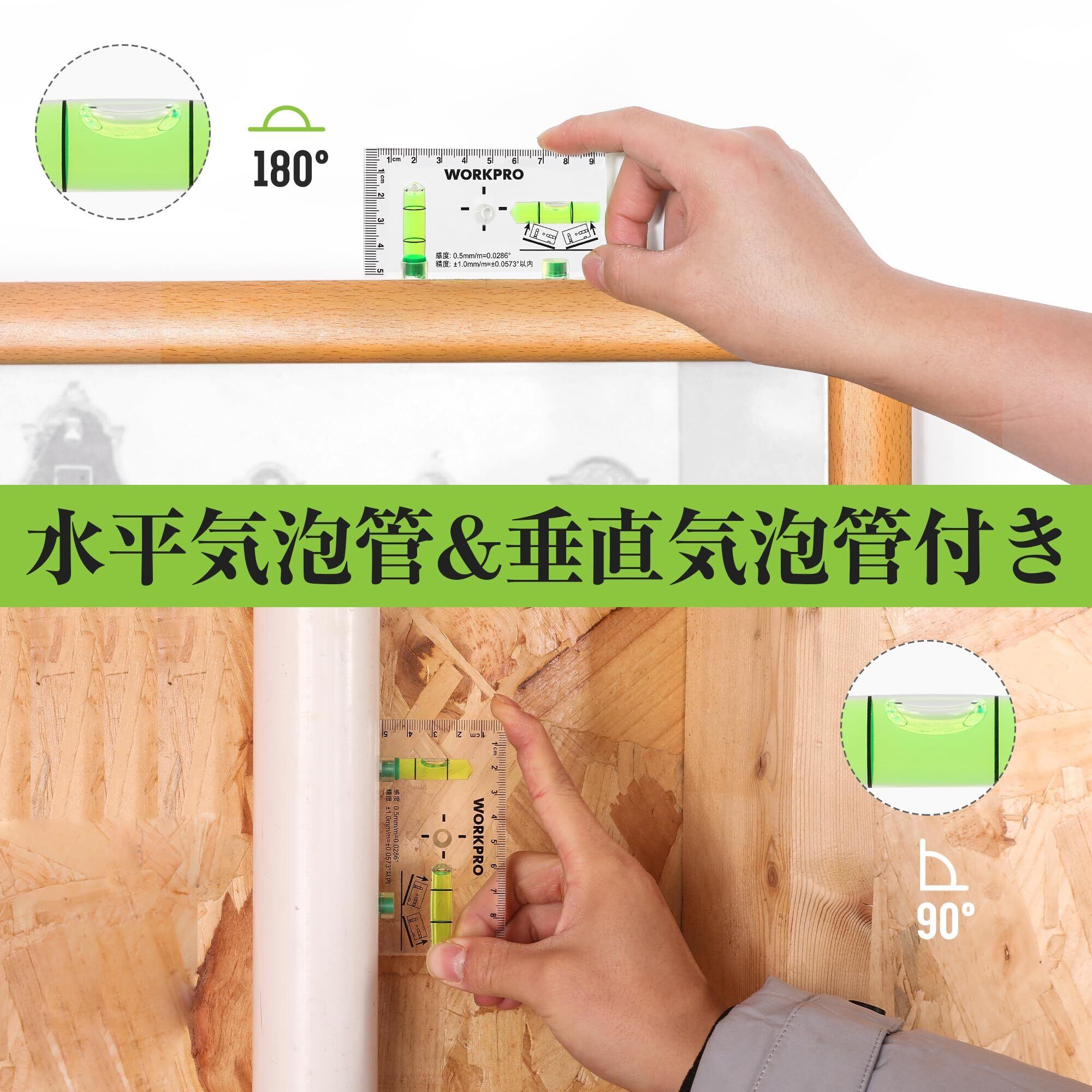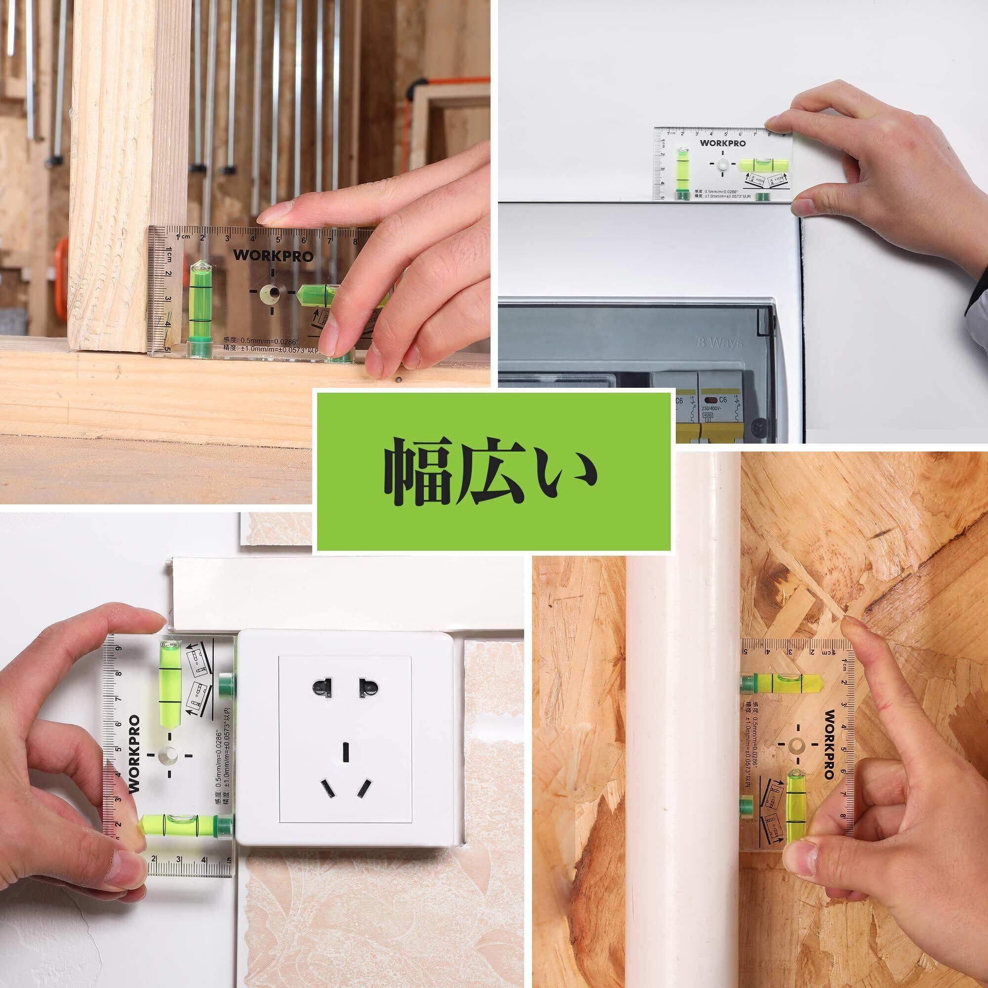 【使用場面】建築、土木、配管、DIY作業で水平、垂直測定を確認できます。さらに、縦と横にメモリがあり、スケールとしても使用できます。