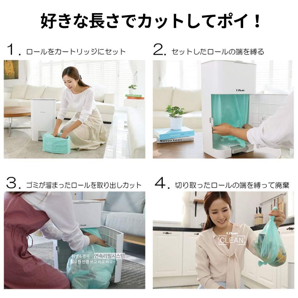 【好きな長さにカットしてポイ!】 ロール式のゴミ袋だから、使った分だけカットして捨てることができます。 ロールをカートリッジにセットしたら、EZkanの扉を開けてロールを下に引っ張ります。ロールの端を縛ればセット完了。 ゴミがたまったら、本体付属のカッターでカットして、切り取ったロールの端を縛って捨てるだけ! ごみ捨てのたびに、新しいゴミ袋を設置する手間を省くことができるので、忙しいママにおすすめです