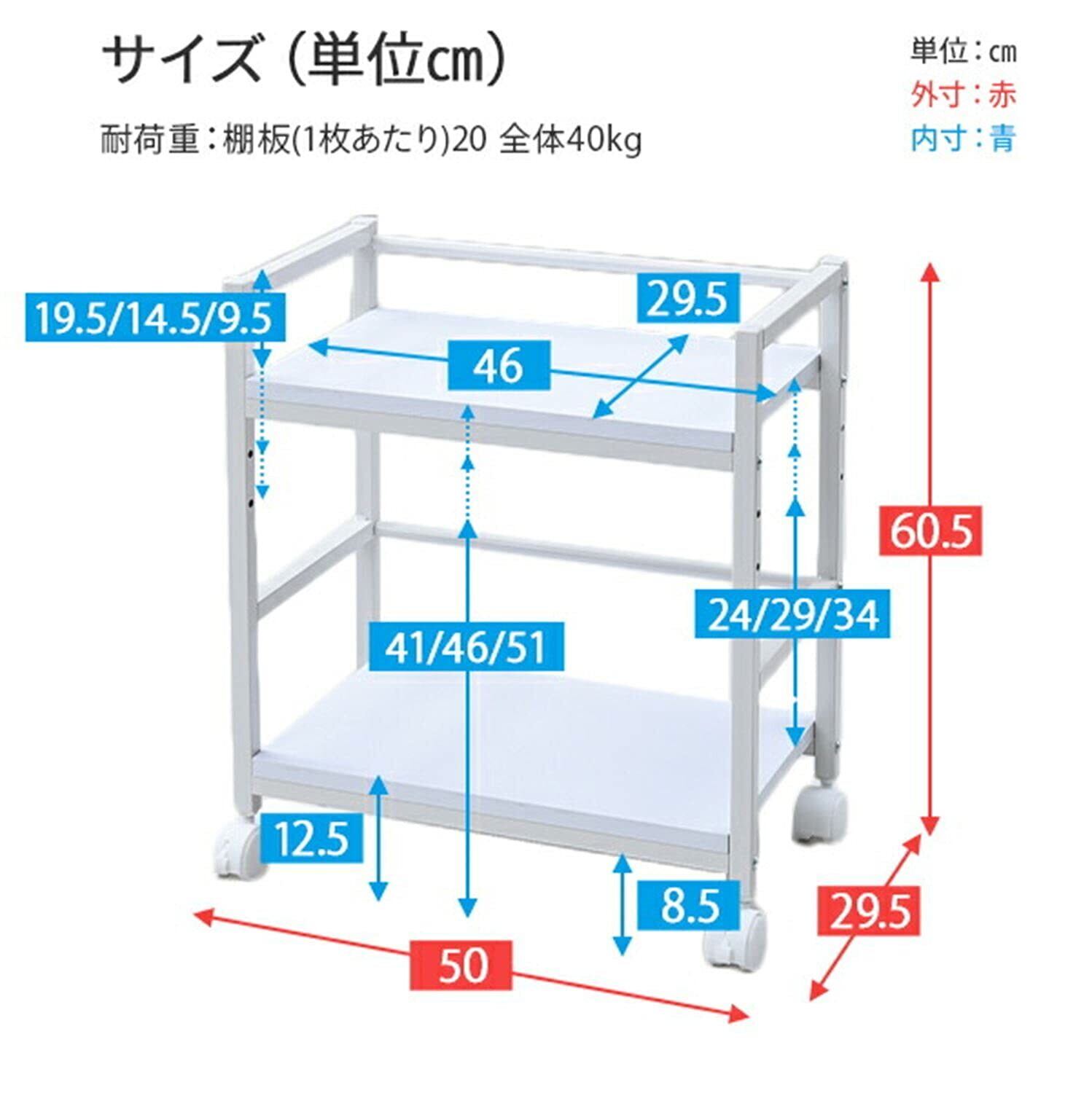 ●本体サイズ:幅50×奥行29.5×高さ60.5cm●全体耐荷重:40kg(棚板1枚あたり : 20kg)●棚板サイズ : 幅46×奥行29.5cm●上棚からサイドフレームまでの高さ : 19.5/14.5/9.5cm●床から上棚までの高さ : 41/46/51cm●床から下棚までの高さ : 12.5cm●棚板間内寸高さ : 24/29/34cm●床から下棚すきま : 8.5cm●構造部材 : フレーム/金属(スチール)、棚板/合成樹脂化粧パーティクルボード(塩化ビニル樹脂)●表面加工 : フレーム/エポキシ樹脂塗装●東証プライム(株)山善で扱うすべての山善商品は、自社もしくは第三者機関において、JIS規格に基づいた品質試験を行っております。
