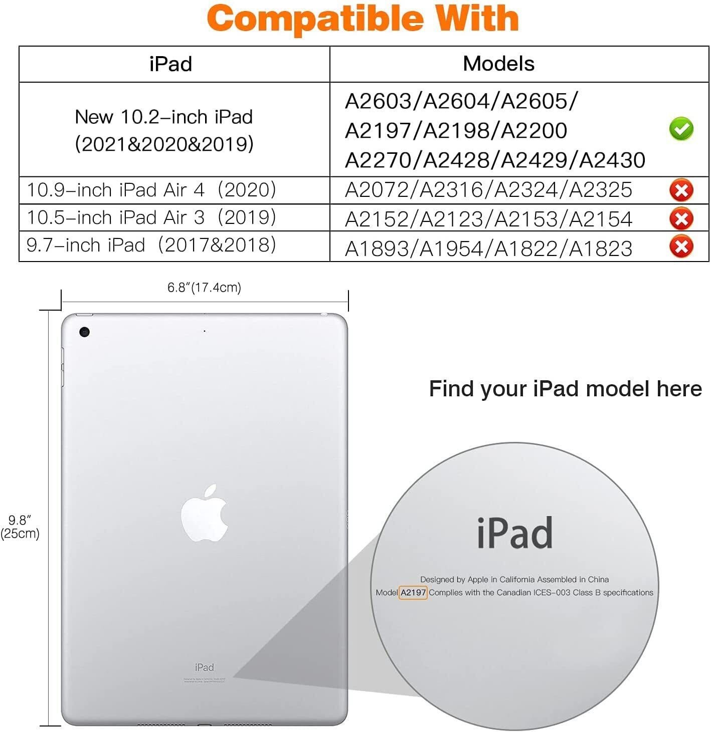[対応機種]: iPad 10.2インチ 第9世代/第8世代/第7世代(2021/2020/2019)を向けに設計した専用スマートカバーとなります。iPad 第9世代 2021 (モデル番号:A2602/A2604/A2603/A2605)、 iPad 第8世代 2020 (モデル番号:A2270/A2428/A2429/A2430)、iPad 第7世代 2019 (モデル番号:A2197/A2198/A2200) 。ご購入になる前に、機種番号をしっかりとご確認してください。