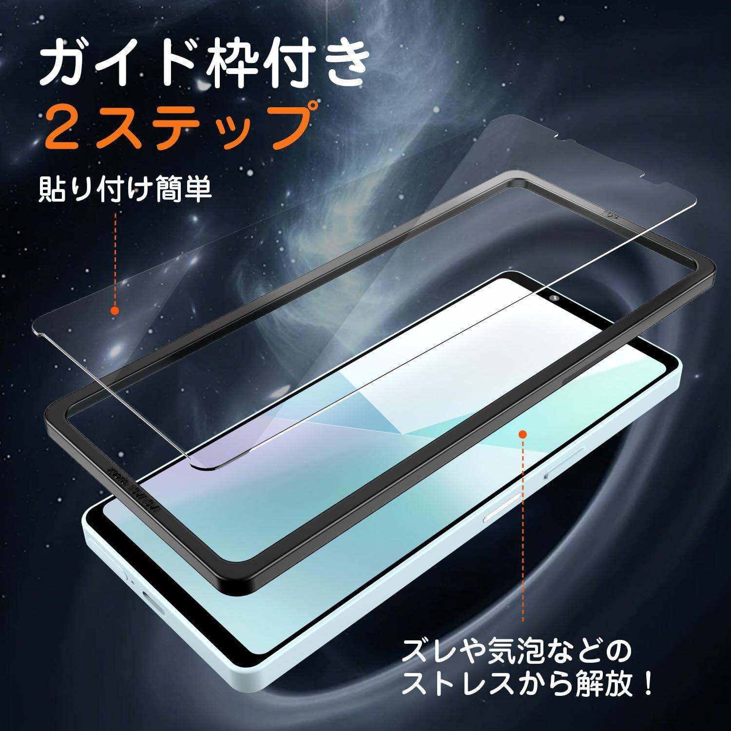 【貼り付け簡単&ガイド枠付き】 2ステップだけで、初心者として完璧に貼り付け!画面に置くだけでキレイに貼れ、気泡も抜けやすい。CNC彫刻加工を採用されたガイド枠はXperia 10 VIの画面にぴったりして、ズレなどのストレスから解放!