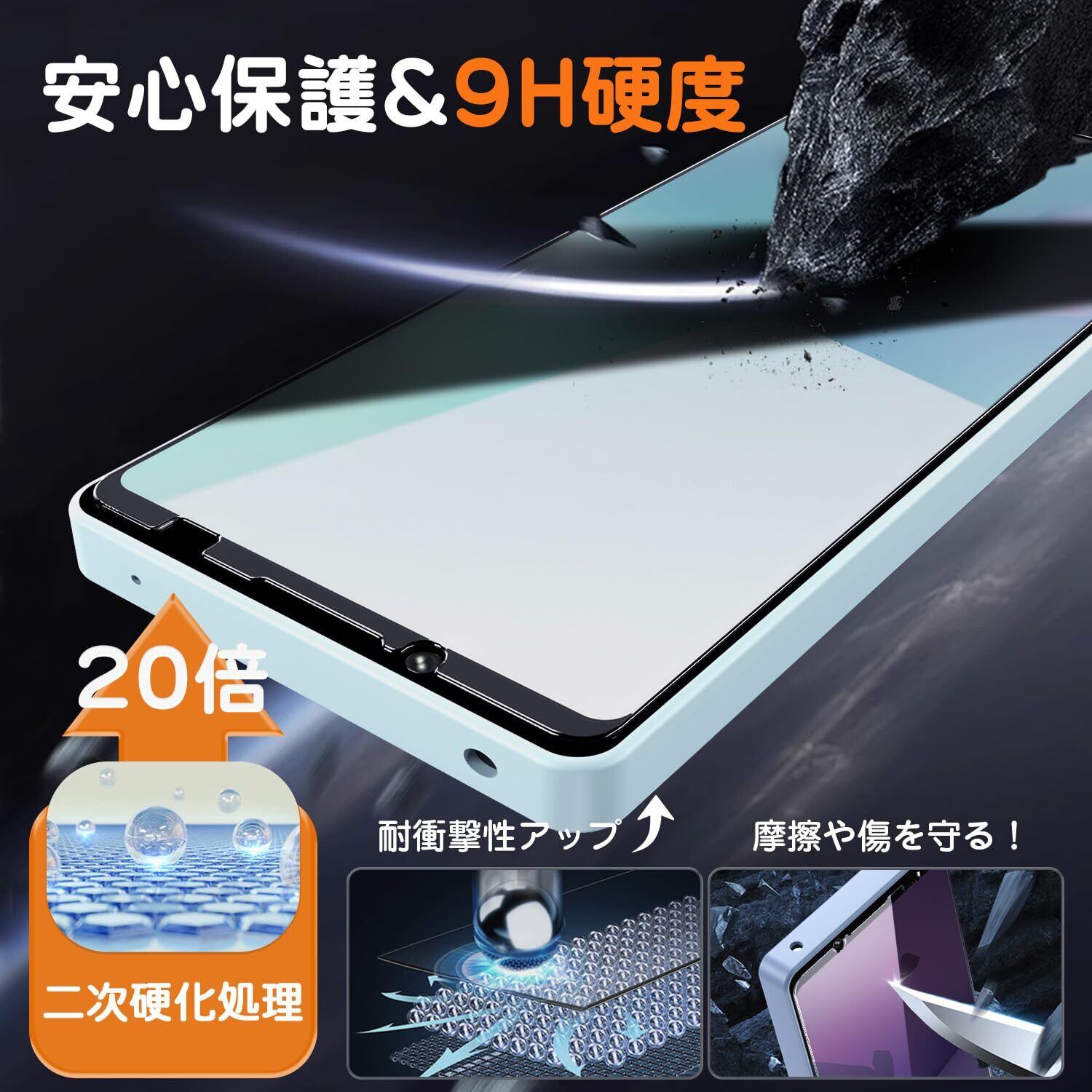 【二次硬化处理&9h硬度】Xperia 10 VI SO-52E フィルムは日本製AGCのガラス材料を採用し、一般的な熱強化処理を行った後に、二次硬化処理を行っています。1000回以上のひっかき傷テストと落下テストに無傷と、落下に対する耐性が高い。每年にわたって、日本で累計10万枚販売し、画面の破損記録がゼロとなっています。