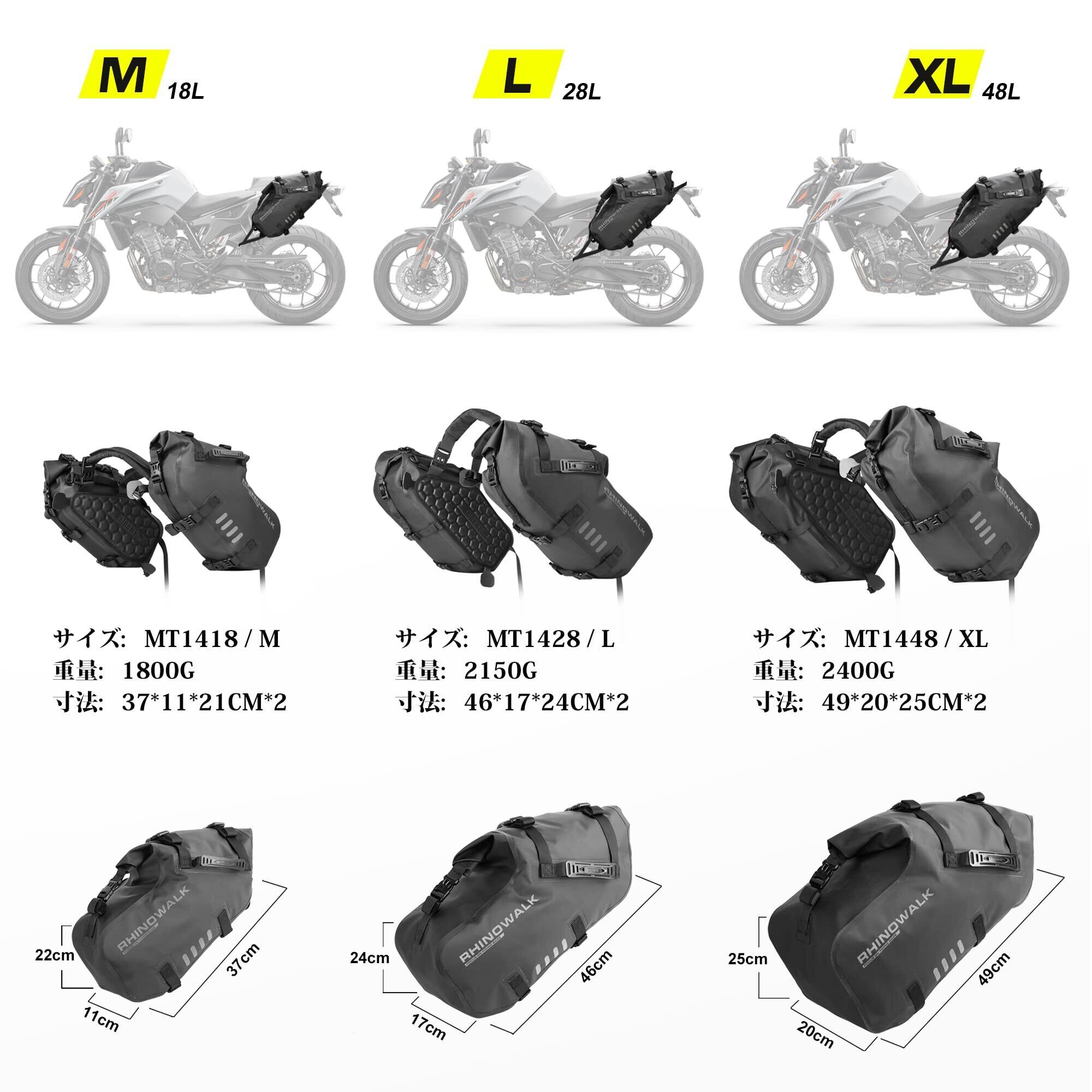 【商品仕様】完全防水防塵サイドバッグ。【容量】M:9L×2 / L:14L×2 / XL:24L×2;【寸法】:M:34*15*21cm(片側)/L:46*17*24cm(片側)/XL:49*20*25cm(片側);【重量】:M:1.8kg(両側)/L:2.15kg(両側)/XL:2.4kg(両側)。