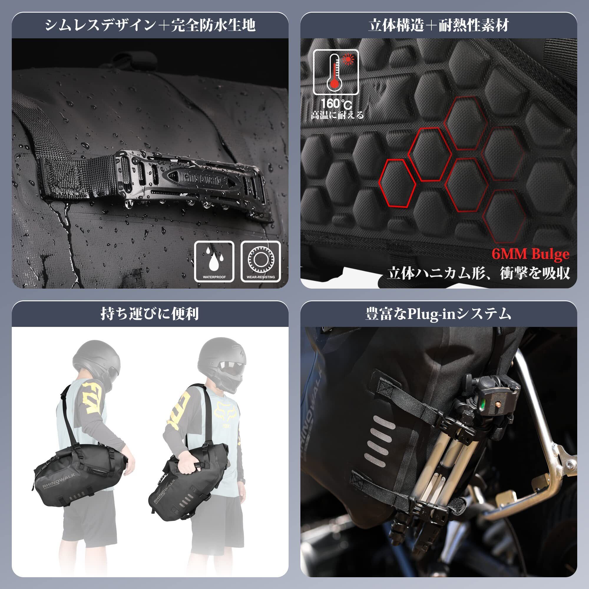 【完全防水&耐久性】防水性と切り裂きに優れている素材を採用し、縫い目のない溶着構造により完全防水防塵を実現。バイクツーリング中に急に雨が降ってきても中の荷物を濡らしてしまう心配もありません。装着が簡単なので、万が一泥汚れなどが付着した場合にも簡単に水で洗い流すことができます。