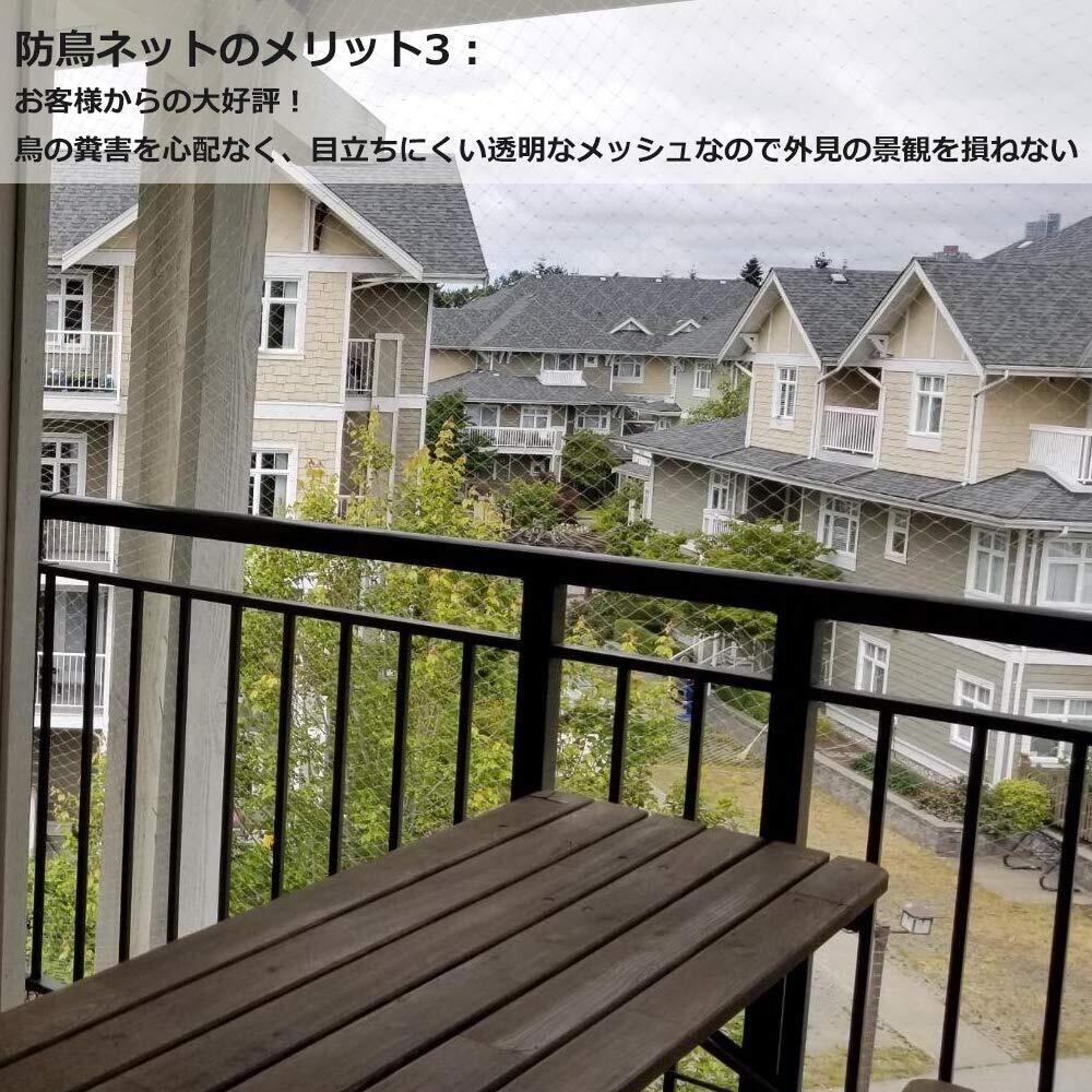 【透明ネット】透明色で目立たなくて建物自身の色味に合わせて、外側の景観も損ないません。目立ちにくい透明なメッシュなので外見の景観を損なわず遮断した感じがなく、周囲の建物色合いに相性が良くて、違和感を生じません。