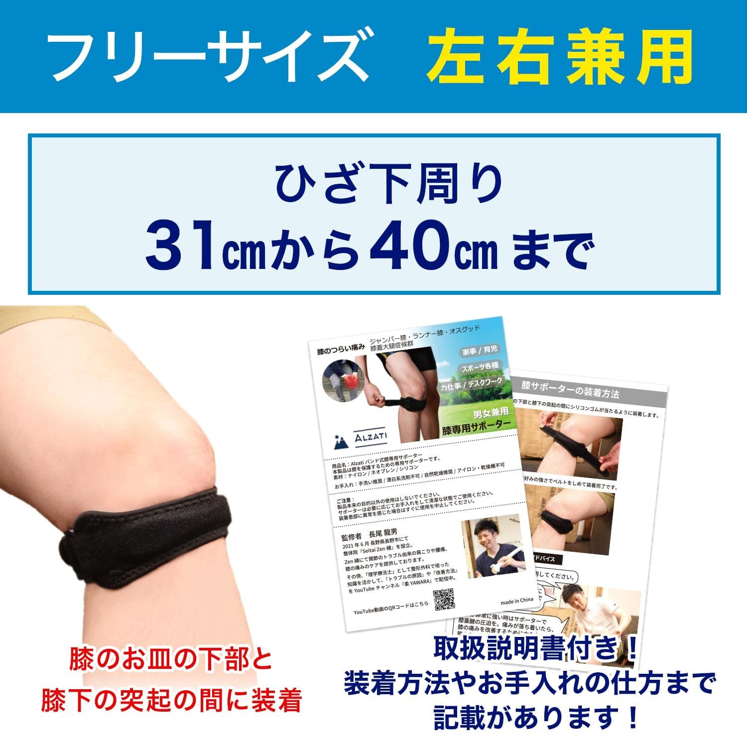 【理学療法士監修】Alzati膝サポーターは理学療法士が監修したバンドタイプのひざ用サポーターです。人体工学に基づいて設計しており日常生活やウォーキング、ランニング、登山などの運動、またバスケ、サッカー、野球、バレーボール、バドミントンなどのスポーツで膝に負担をかけている方におすすめです。