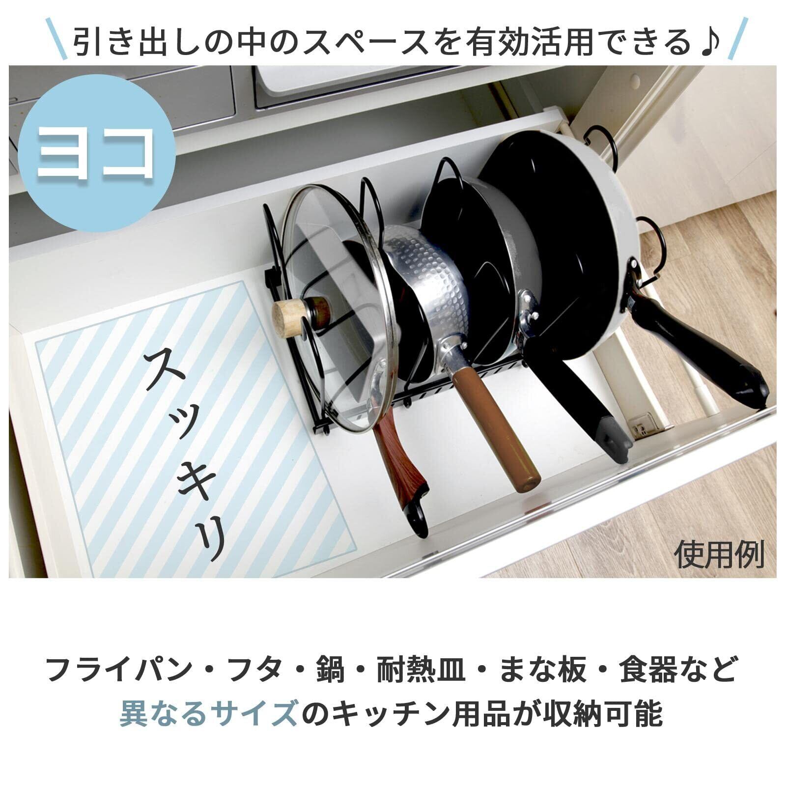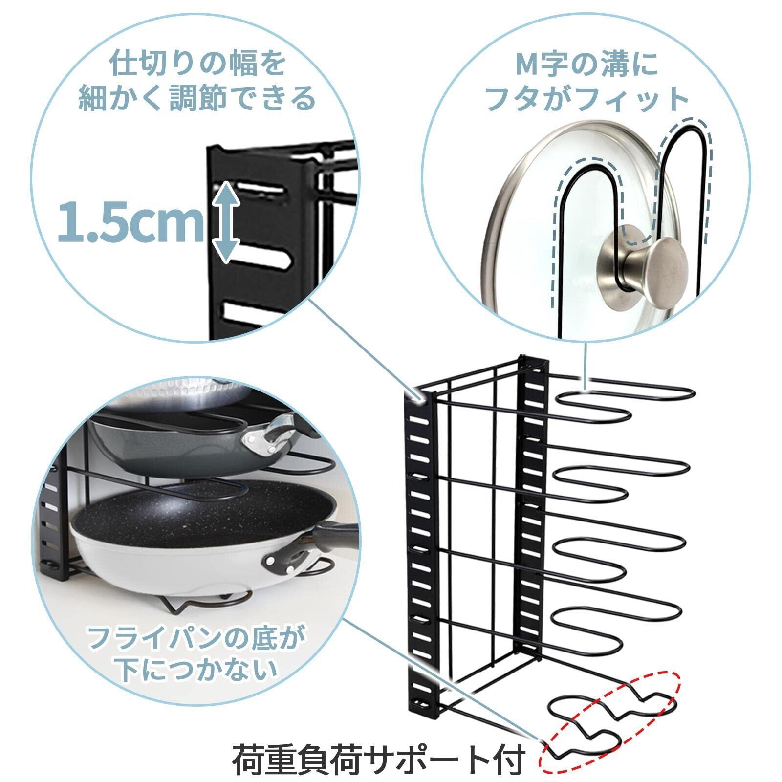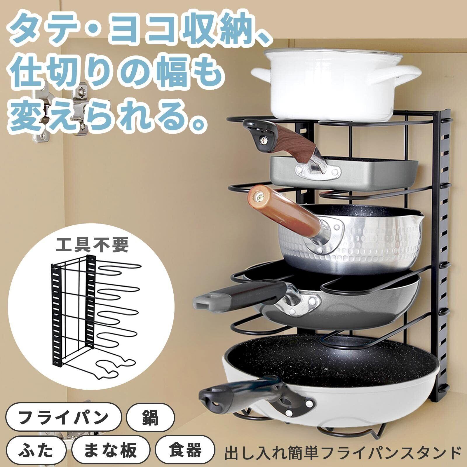 [コモライフ] 出し入れ簡単 フライパンスタンド キッチンラック 鍋 蓋 収納 縦置き 横置き 段数 幅調節OK