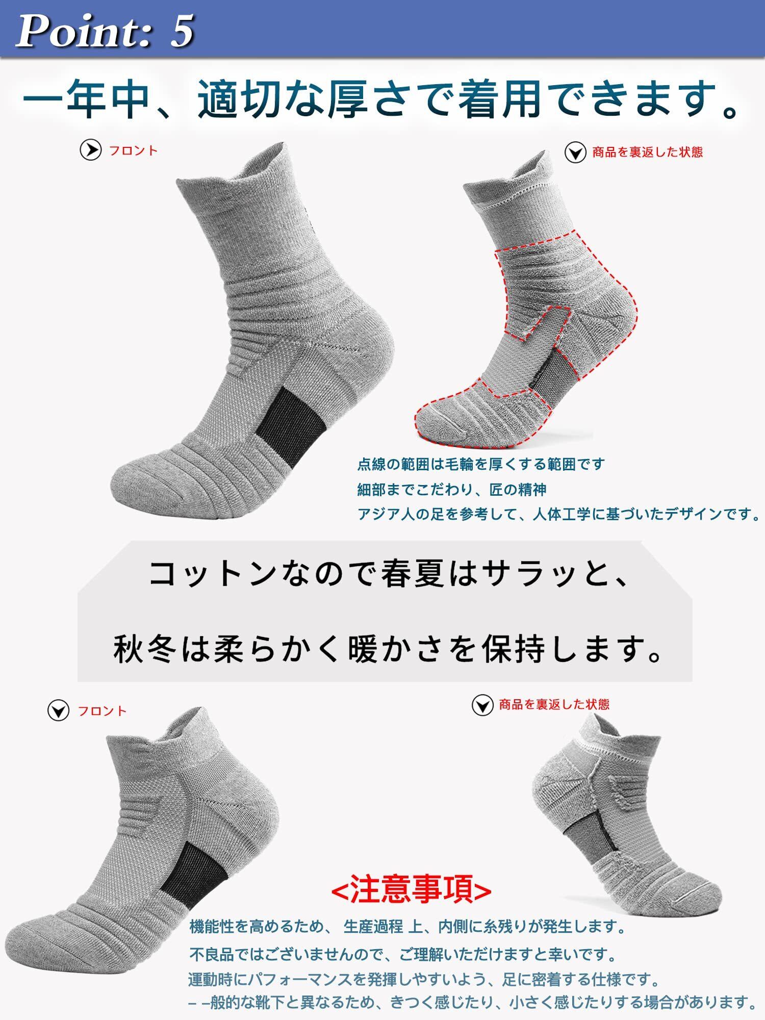 【肌触りと耐久性も抜群です】天然長日照コットンを採用した故、毛落ちや毛玉が発生しにくく、水洗いでも色落ちや収縮が発生せず、柔らかくて通気性も優れており。つま先、甲、かかとを全方向に補強します、足ズレを防止できるし、衝撃を受けた時足を守ることもできます。通気メッシュを加えて、熱気を発散させ、いつまでも快適のままにいられます。