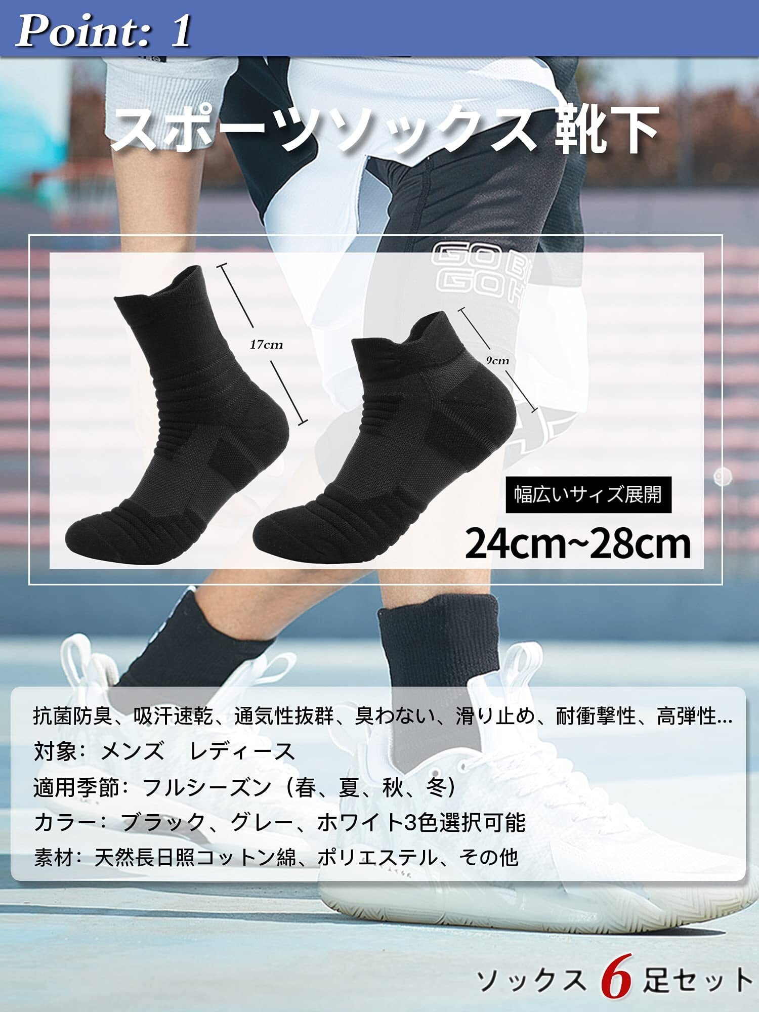 【商品仕様】6足セット、サイズ:24-28cm 。素材:90%の綿+10%ポリエステル。通気、吸湿、抗菌·防臭効果のおかげで長時間運動したり歩いたりしても臭いはありません、一日中快適に着用できます。ランニング、サッカー、バスケットボール、トレーニングなどのさまざまなスポーツに適しています。
