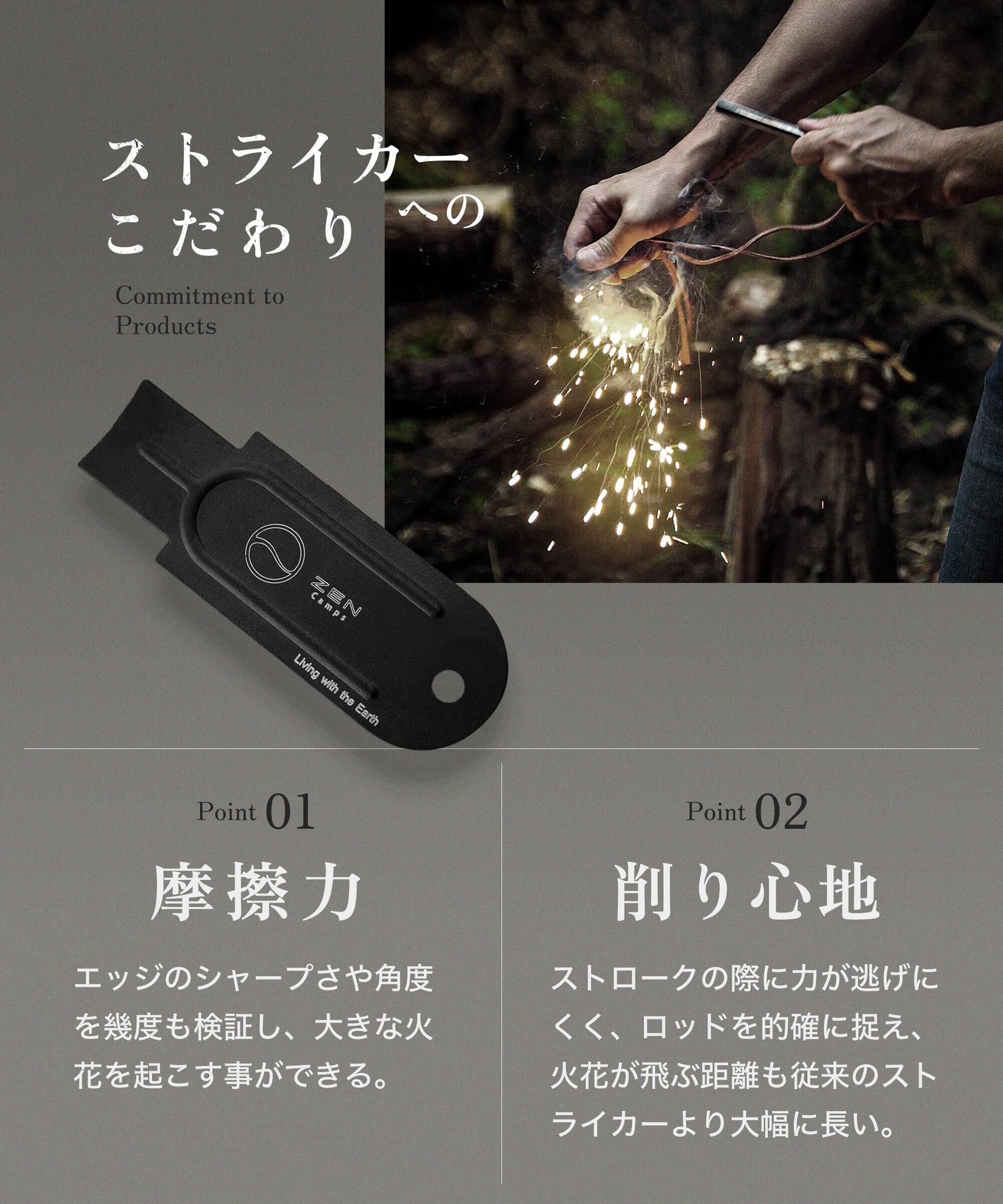 ZEN Campsが1年以上の開発期間をかけて開発したファイヤースターターです。素材、硬度、形状に優れたロッド、火花を散らすことを徹底的に考え抜いたストライカー、これらによって異次元の着火力を実現しました。これまでファイヤースターターで火起こしがうまくできなかった方、初めて火おこしに挑戦する方にもおすすめです。ブッシュクラフトでは必須のアイテムです!