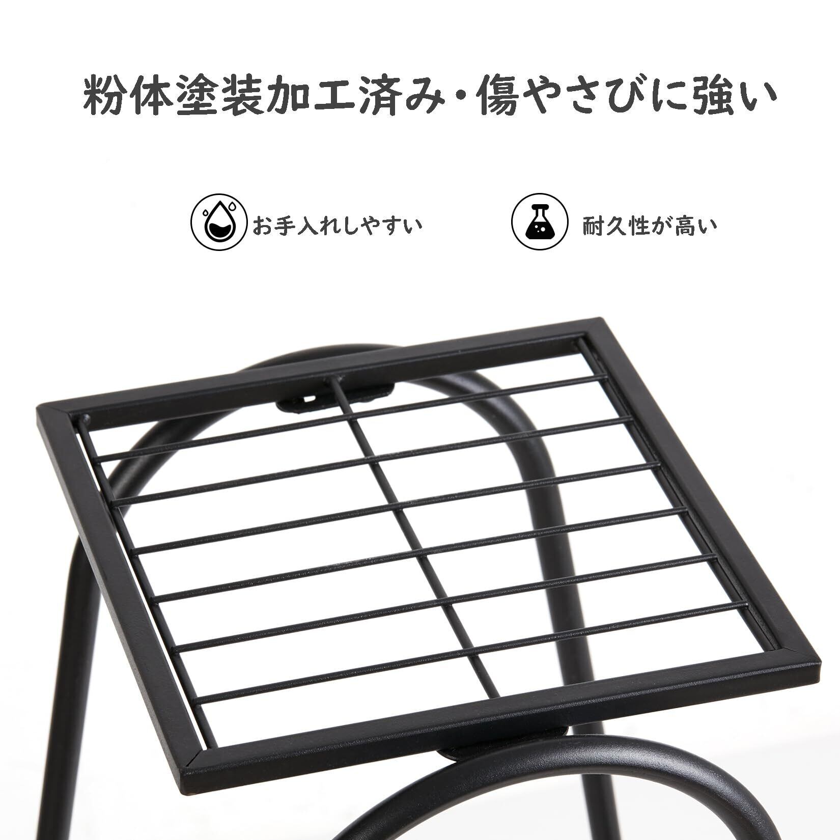 【頑丈な植物棚】耐食性や強靭性にも優れているスチールパイプを採用していて、長期間使用しても劣化やゆがみが少ないです。しっかり支えてくれるので、重さのある鉢や花瓶も飾って楽しむことができます。粉体塗装加工もされていて、傷やさびに強くなり、耐候性や耐久性も高まりました