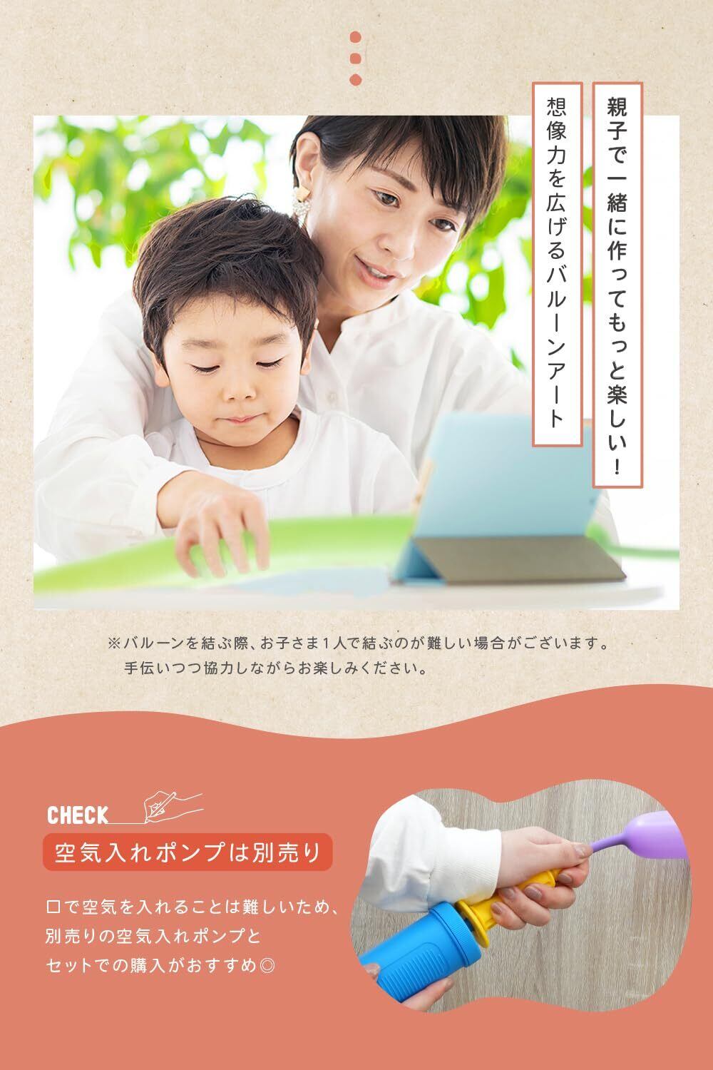 【お子さまと一緒に楽しめる!丈夫で扱いやすい高品質バルーン】 割れにくく丈夫な素材を採用しているので、小さなお子さまと一緒に安心してバルーンアートを楽しめます!初心者でも使いやすい設計で、バルーンアートの扱い方や動物や花などの作り方を解説した動画付きWEBマニュアルをご用意。初めての方でも手順を確認しながら楽しく挑戦できるので、親子で特別な時間をお過ごしいただけます