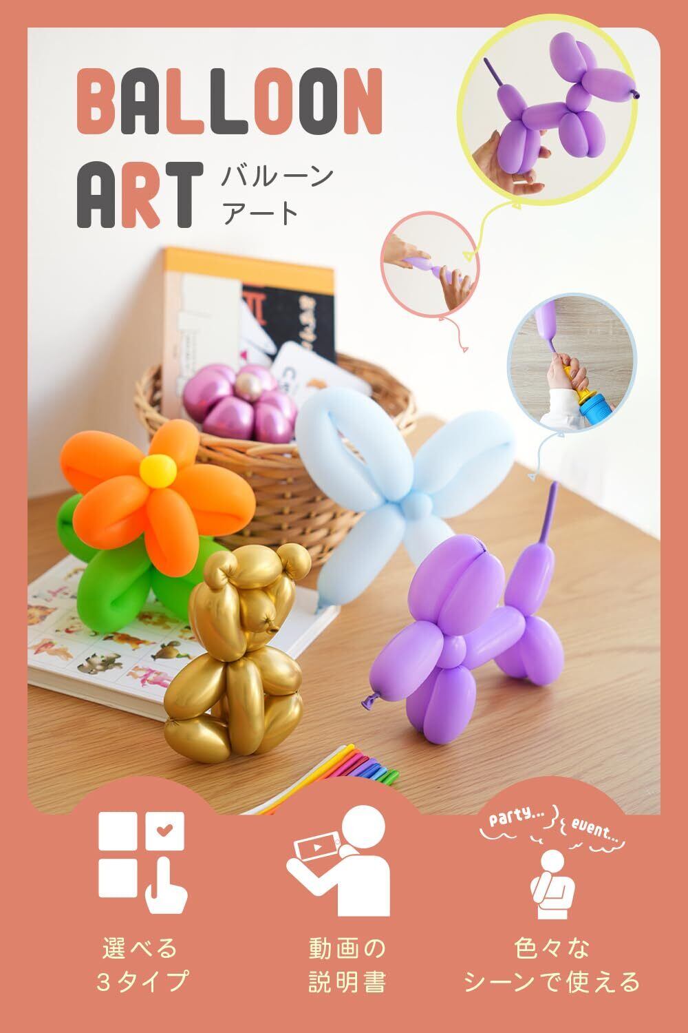 【多様なシーンで活躍】バルーンアートの動物や花、文字など、自由に作れるアイテムとして誕生日パーティー、結婚式、学校イベント、店舗装飾など、あらゆるシーンを彩ります。選べる3つのバリエーションで、イベントのテーマや雰囲気にぴったりの色味を演出できます。
