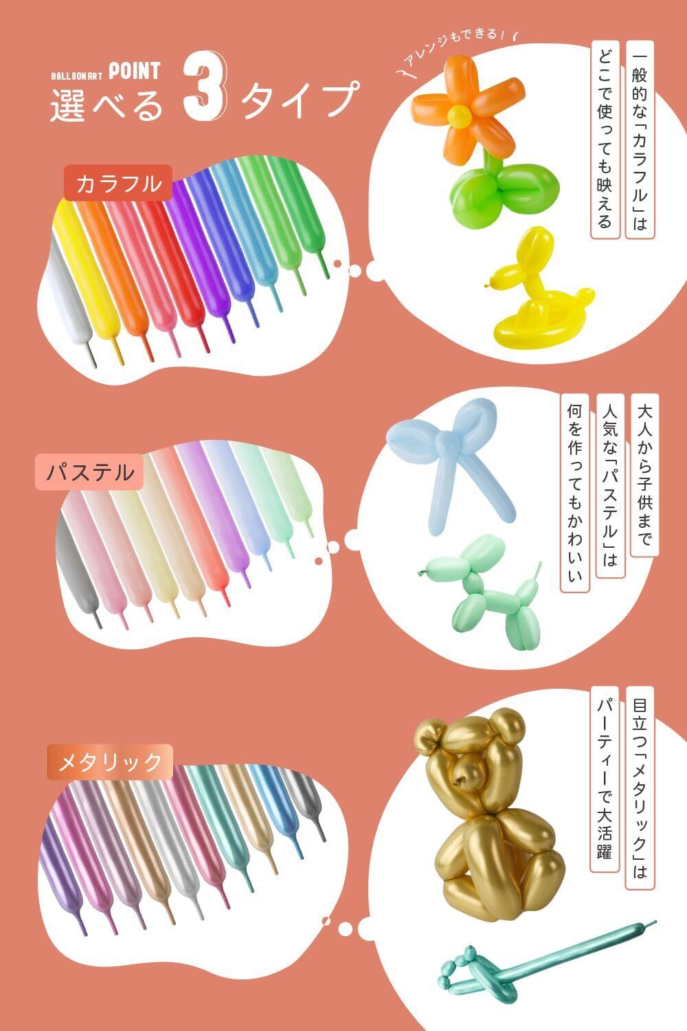 【カラバリ豊富で選べるバルーンアート風船】バルーンアート初心者でも簡単!親子で楽しめる^^従来のバルーンセットには「どんな色が入っているかわからない」「色に偏りがある」といった声がありました。そんなお客様の声にお応えし、当社のバルーンアート風船はカラフル・パステル・メタリックの3つのバリエーションをご用意!それぞれ10色×10本ずつの計100本入りでお届けするため、必要な色味を自由に選べます。お子さまのイベントや装飾にぴったりなバルーンセットです 【お子さまと一緒に楽しめる!丈夫で扱いやすい高品質バルーン】 割れにくく丈夫な素材を採用しているので、小さなお子さまと一緒に安心してバルーンアートを楽しめます!初心者でも使いやすい設計で、バルーンアートの扱い方や動物や花などの作り方を解説した動画付きWEBマニュアルをご用意。初めての方でも手順を確認しながら楽しく挑戦できるので、親子で特別な時間をお過ごしいただけます 【カラーバリエーションの魅力】カラフル:ビビッドで色鮮やかな原色カラーは、イベントや装飾に映えること間違いなし!明るくポップな演出をしたい場面にぴったりです。 パステル:子どもから大人まで人気のパステルカラーは、何を作っても可愛く仕上がる万能カラー温かみがあり、やわらかい印象を演出できます。 メタリック:光沢感が特徴のメタリックカラーは、高級感あふれるエレガントなパーティーや特別な場面に最適。目を引く演出で、場を華やかに彩ります! 【多様なシーンで活躍】バルーンアートの動物や花、文字など、自由に作れるアイテムとして誕生日パーティー、結婚式、学校イベント、店舗装飾など、あらゆるシーンを彩ります。選べる3つのバリエーションで、イベントのテーマや雰囲気にぴったりの色味を演出できます。 【カラバリ豊富で選べるバルーンアート風船】バルーンアート初心者でも簡単!親子で楽しめる^^従来のバルーンセットには「どんな色が入っているかわからない」「色に偏りがある」といった声がありました。そんなお客様の声にお応えし、当社のバルーンアート風船はカラフル・パステル・メタリックの3つのバリエーションをご用意!それぞれ10色×10本ずつの計100本入りでお届けするため、必要な色味を自由に選べます。お子さまのイベントや装飾にぴったりなバルーンセットです 【お子さまと一緒に楽しめる!丈夫で扱いやすい高品質バルーン】 割れにくく丈夫な素材を採用しているので、小さなお子さまと一緒に安心してバルーンアートを楽しめます!初心者でも使いやすい設計で、バルーンアートの扱い方や動物や花などの作り方を解説した動画付きWEBマニュアルをご用意。初めての方でも手順を確認しながら楽しく挑戦できるので、親子で特別な時間をお過ごしいただけます 【カラーバリエーションの魅力】カラフル:ビビッドで色鮮やかな原色カラーは、イベントや装飾に映えること間違いなし!明るくポップな演出をしたい場面にぴったりです。 パステル:子どもから大人まで人気のパステルカラーは、何を作っても可愛く仕上がる万能カラー温かみがあり、やわらかい印象を演出できます。 メタリック:光沢感が特徴のメタリックカラーは、高級感あふれるエレガントなパーティーや特別な場面に最適。目を引く演出で、場を華やかに彩ります! 【多様なシーンで活躍】バルーンアートの動物や花、文字など、自由に作れるアイテムとして誕生日パーティー、結婚式、学校イベント、店舗装飾など、あらゆるシーンを彩ります。選べる3つのバリエーションで、イベントのテーマや雰囲気にぴったりの色味を演出できます。