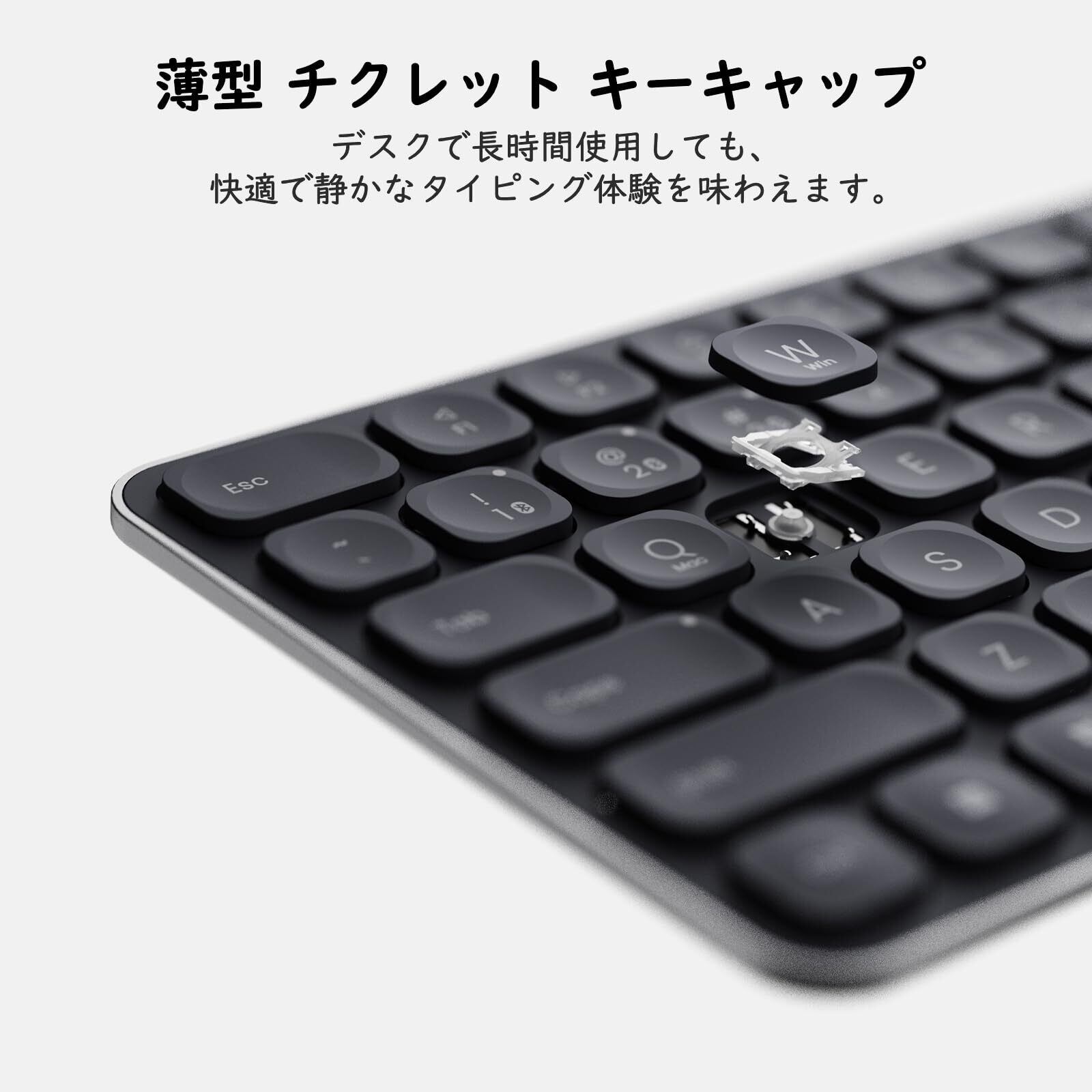 滑らかなタイピング体験&マルチメディアキー:ラップトップ並みの薄型デザインに加え、指先にフィットする内側に湾曲した丸みを持つキーにより、速く、滑らかで、正確かつ静粛なタイピング体験を実現します。また、Windows および Mac OS のデュアルシステムショートカットに対応し、再生 / 一時停止、音量増減など、12 個の汎用的な機能キーを搭載しています。