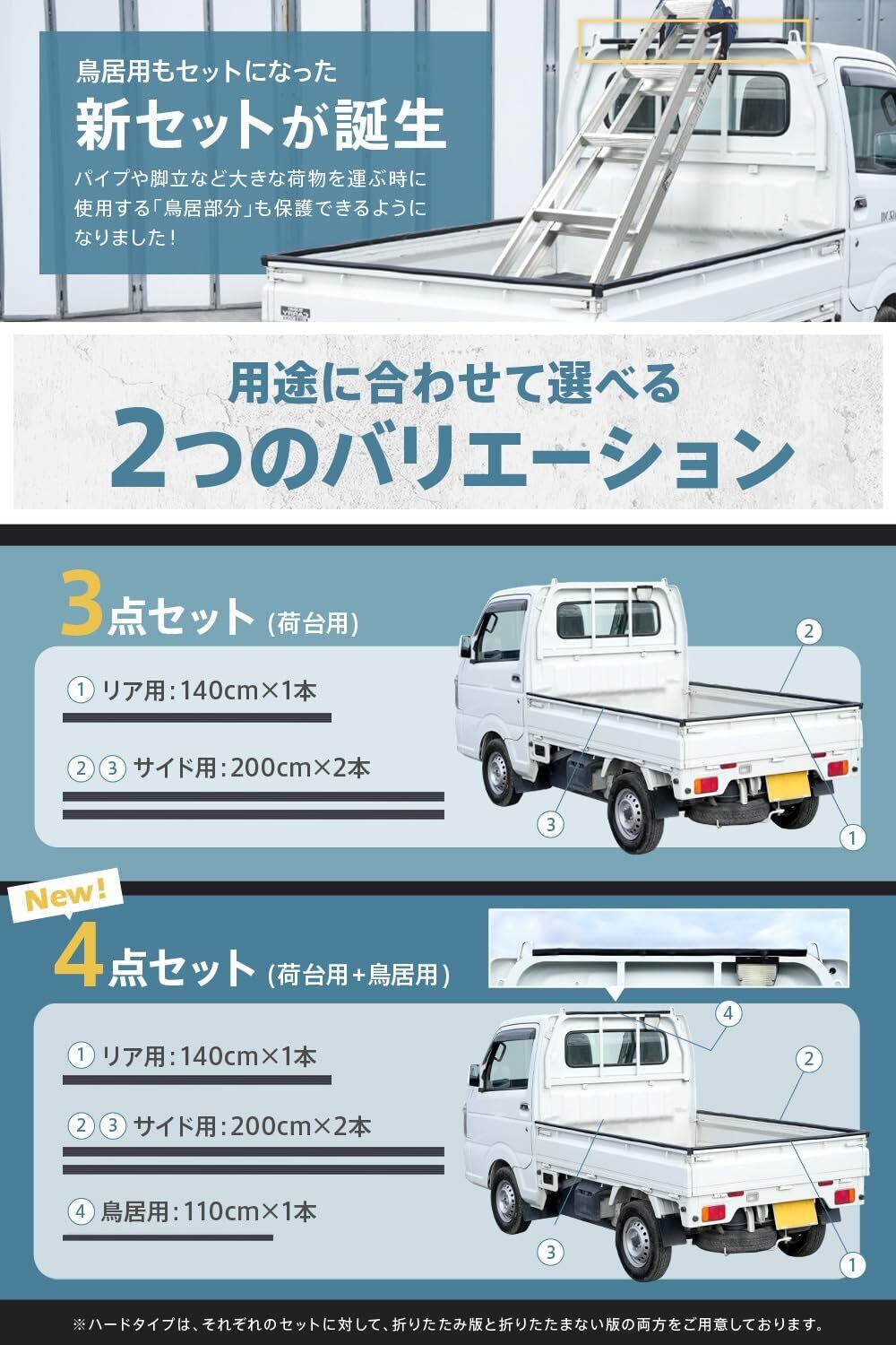 【用途に合わせて使えるバリエーション】軽トラのあおり部分に加え、要望の多かった鳥居のゲートプロテクター(あおりガード )もバリエーションに追加しました。はしごやポールなど長いものを運搬する際に重要となる鳥居。ゲートプロテクター(あおりガード )を装着することで滑り止めにもなり固定され安心して軽トラ走行できます。
