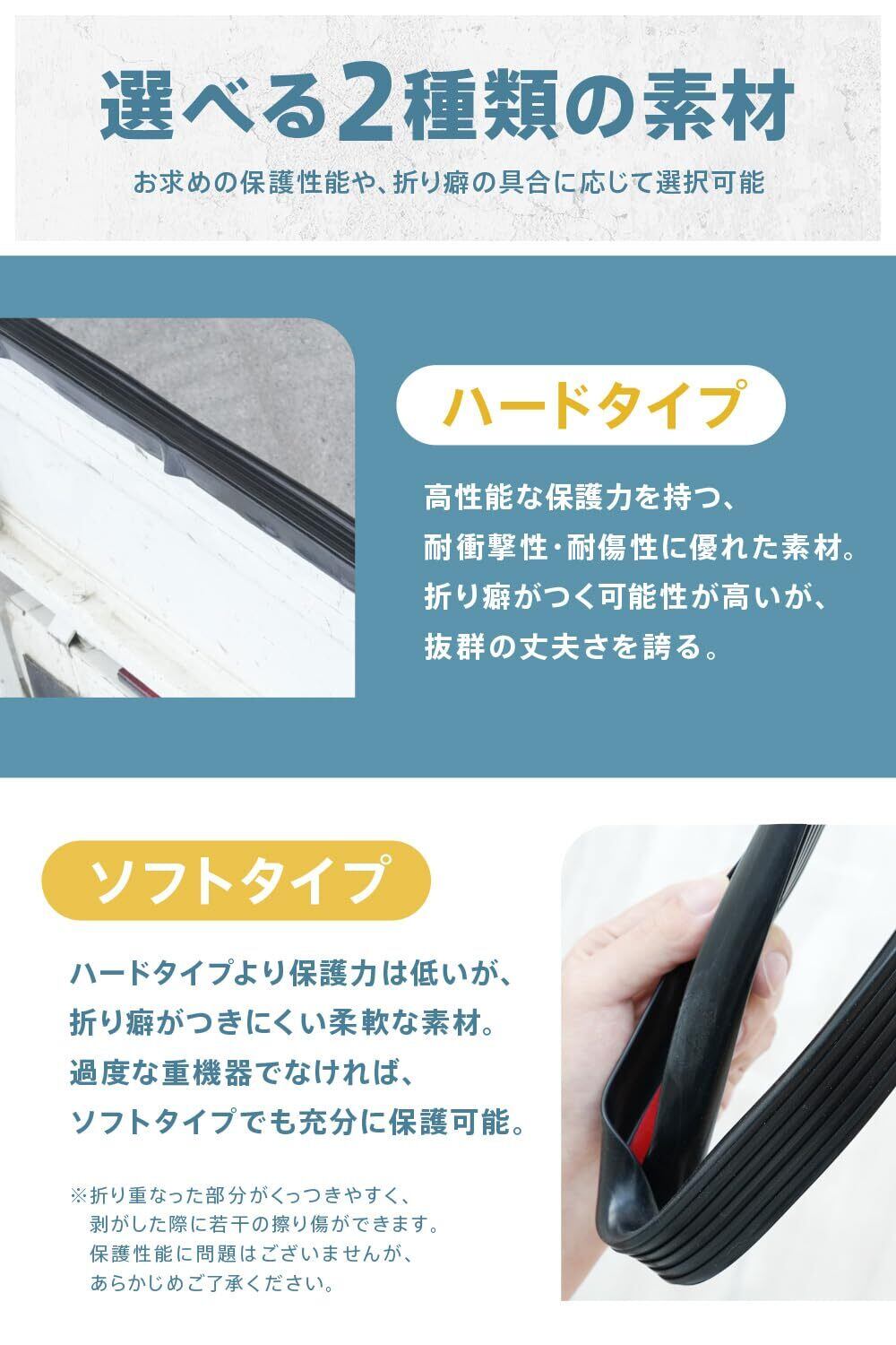 【劣化しにくい1本物設計】分割タイプと比較し1本物は隙間ができないので、雨や汚れがあおり部分に触れることがなく劣化を防ぎしっかりガードします。※1本ものにこだわったため、どうしても折りたたんでの発送となります。ゴムの性質上一時的に折り目がつきますが、日光やドライヤーの温風など温かい場所に置きますと柔らかくなり通常よりも貼り付けしやすくなりますので是非お試しください。
