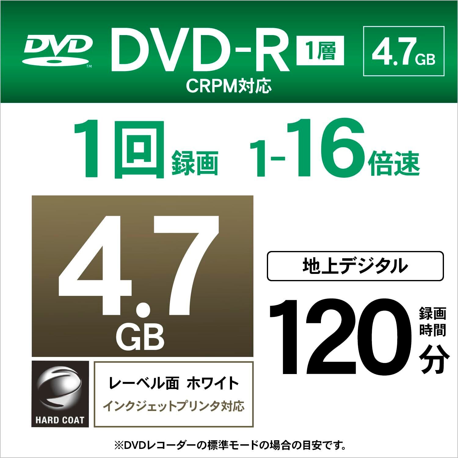 盤面印刷:○(ホワイト) / 範囲:23mm-118mm(ワイド) 倍速:1-16倍速,ケース:スピンドルケース,入り数:50枚 容量 : 4.7GB 1回録画用 レーベル対応:インクジェットプリンタ対応、CPRM:対応 品種:録画用 DVD-R 録画時間:120分 スピンドルケース仕様