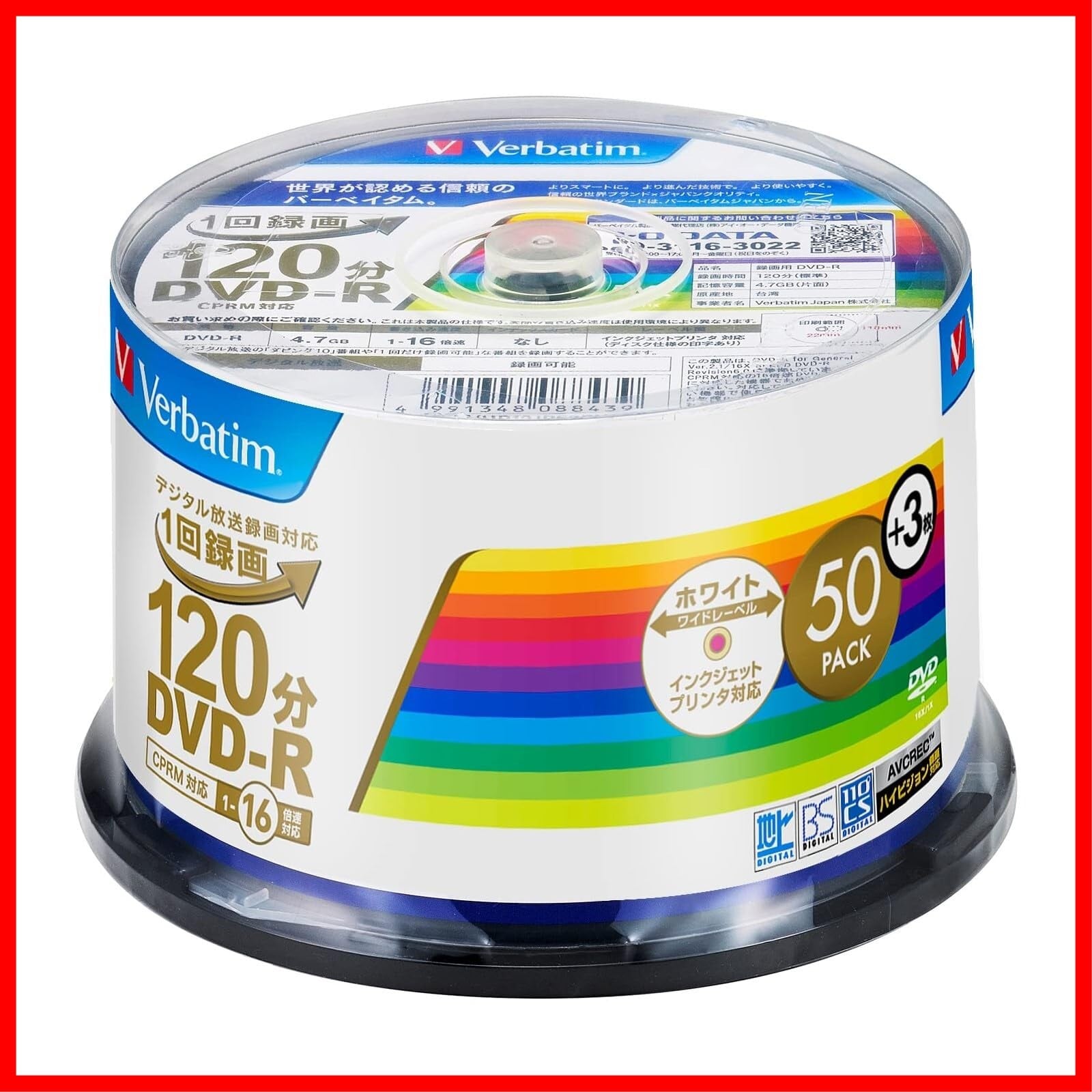 バーベイタム(Verbatim) 1回録画用 DVD-R CPRM 120分 【50枚+3枚増量パック】 インクジェットプリンタ対応 ホワイト片面1層 1-16倍速 VHR12JP53SV4 | hananoki