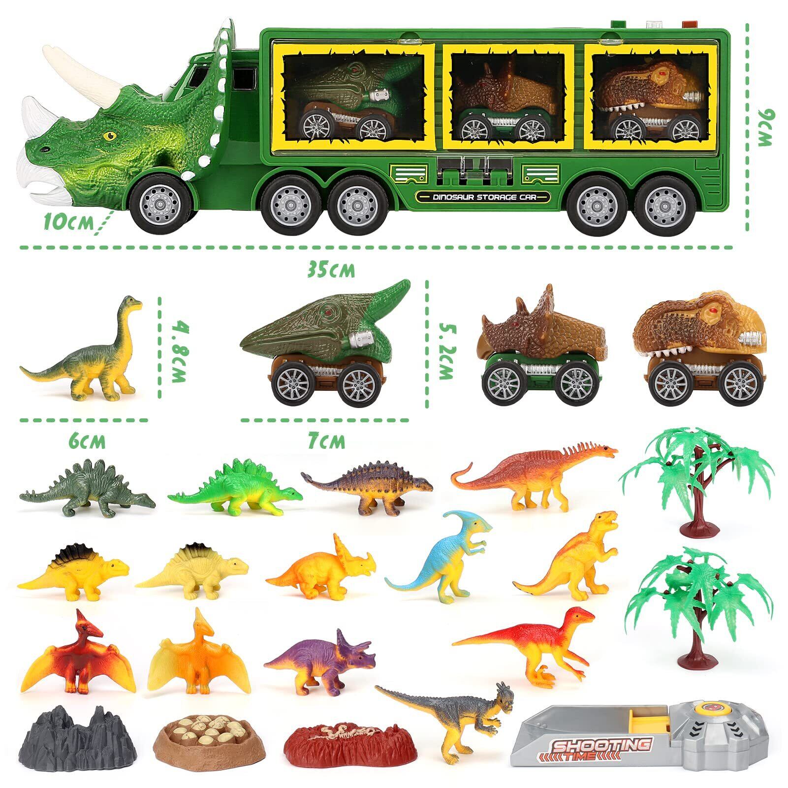【恐竜 おもちゃ】恐竜トラック1台、引き戻し恐竜車3台、恐竜フィギュア12体、樹木2体、恐竜の卵1体、化石1体、岩1体が23個入り。重量:0.8kg