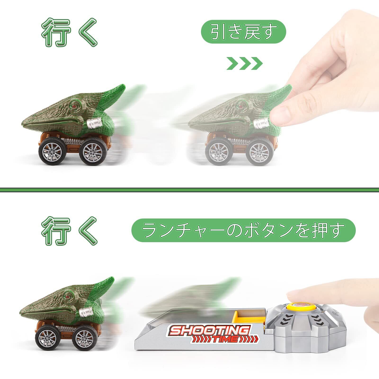 【車 おもちゃ】バッテリー不要、3台の恐竜カーをゆっくりと引き戻すだけで前進でき、ランチャーやトラックとの併用も可能です。