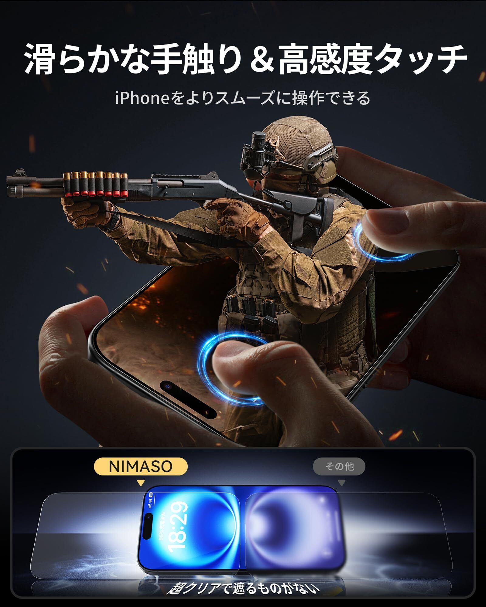 「指紋防止・滑らかな触り心地」本製品は撥水撥油のAF(Anti-Fingerprint)コーティング加工とスムーズタッチ加工により、指紋や汚れがつきにくく、油分や水分が強く付着した汚れや指紋がついても、拭き取るだけで綺麗になれます。また、使用時の手触りも滑らかで、毎日のドラマ視聴やオフィス仕事、ゲームなどの邪魔になりません。常に美しいiPhone16 の画面をお楽しみいただけます。