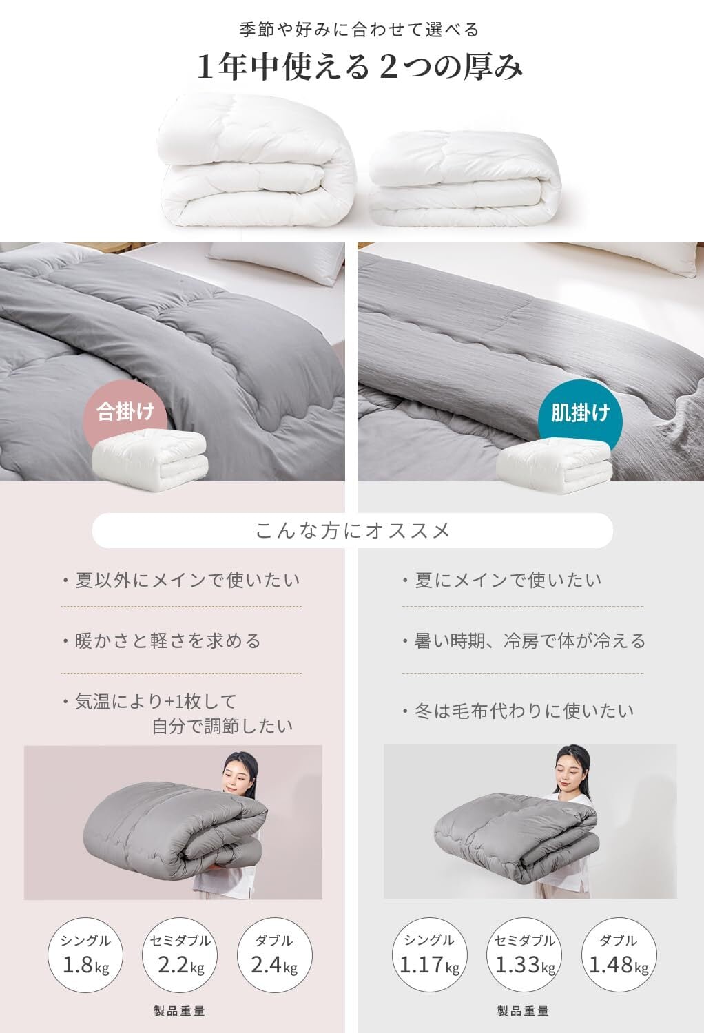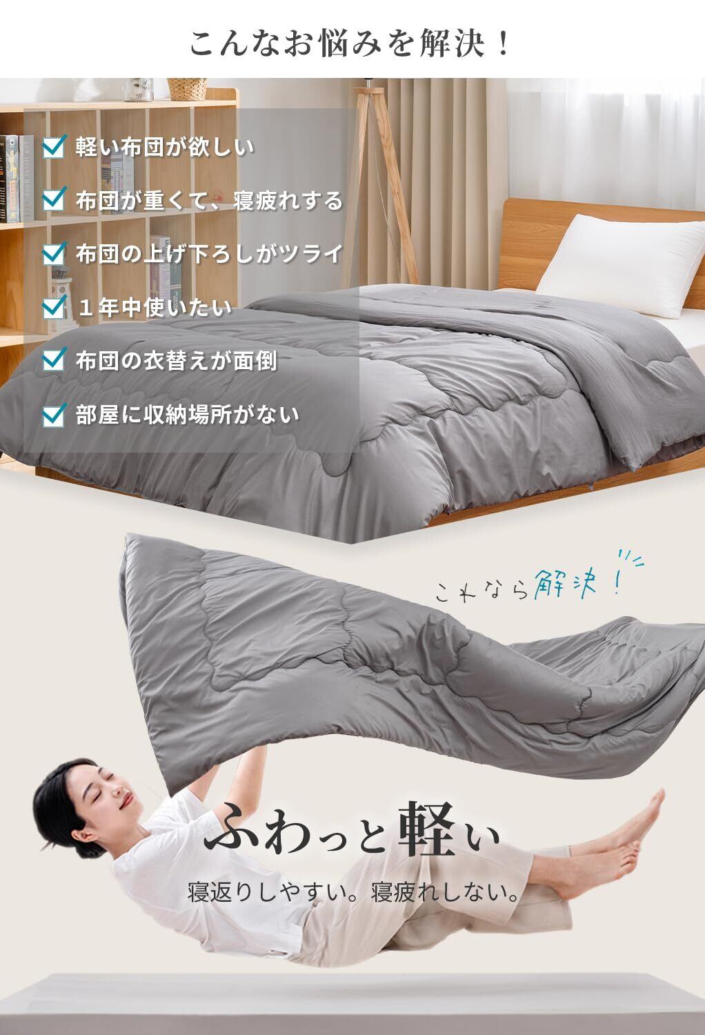 【フワっと軽い!】フワっと軽く体を包んでくれるので、よりリラックスした眠りに。女性でも持ち運びラクラク!来客用にもピッタリです。
