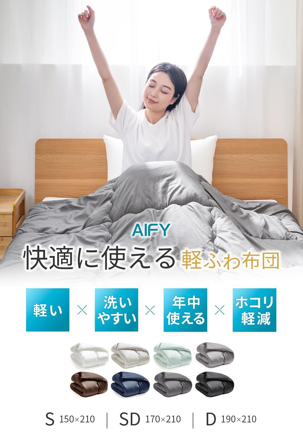 AIFY 掛け布団 セミダブル 170×210cm 【薄手(肌掛け)春夏秋向け】 洗える 軽量 抗菌 防ダニ 通気 【SEK認証】 グレー (約1.3KG)