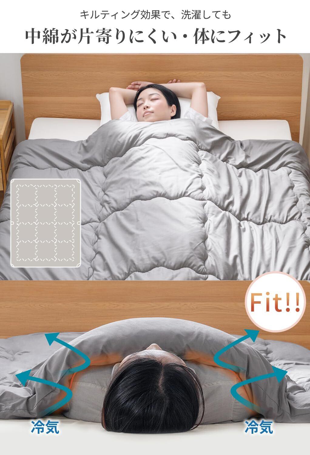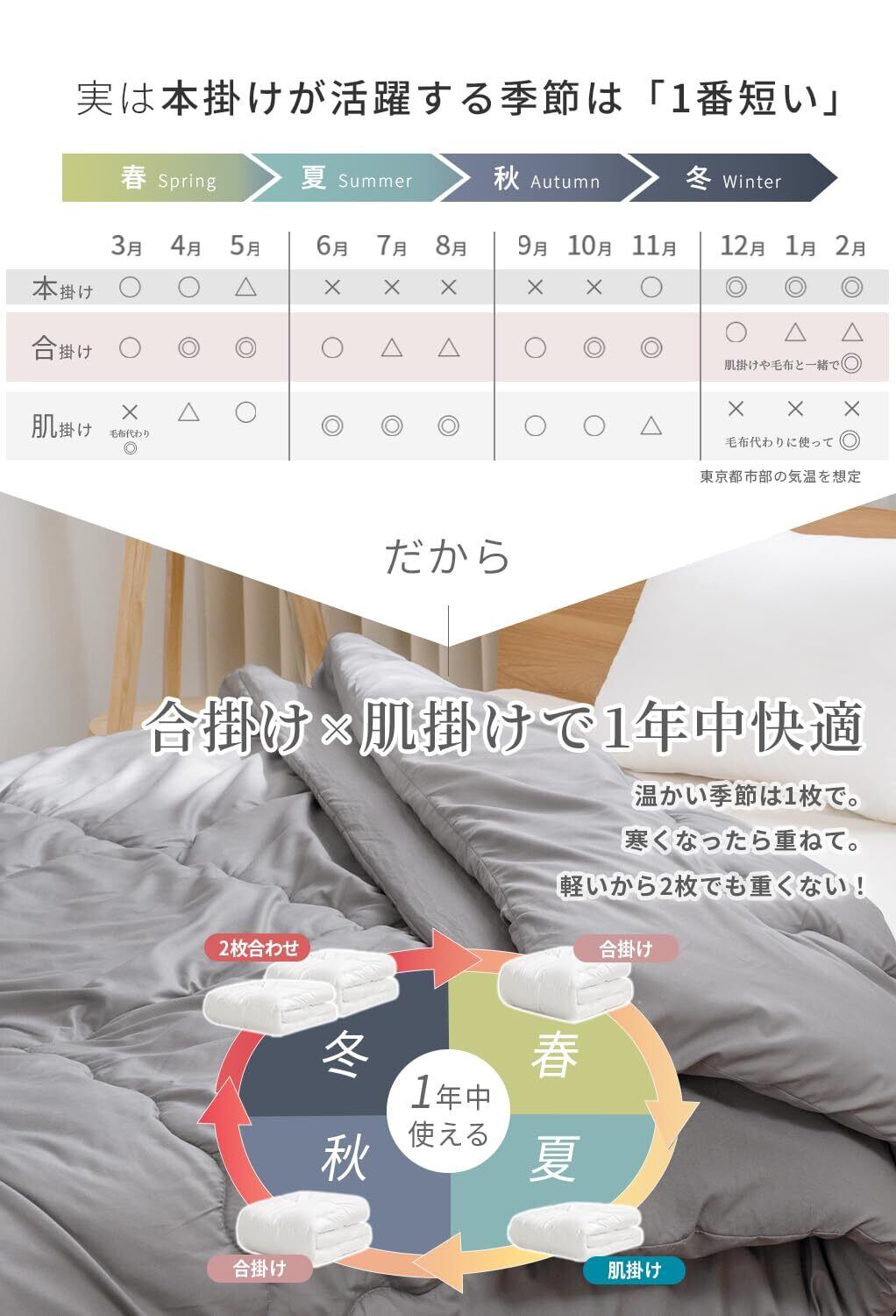 【体に優しい、ふわふわ超軽量布団】通常の掛け布団より約半分のわた量で、ふんわりと軽やかな使い心地。体にのせても圧迫感ゼロで、寝返りもスムーズ。適度な保温性で、春の肌寒い夜から初秋の涼やかな朝まで、ちょうどいい温もりをキープ。季節の変わり目に寄り添う、上質な軽やかさ。