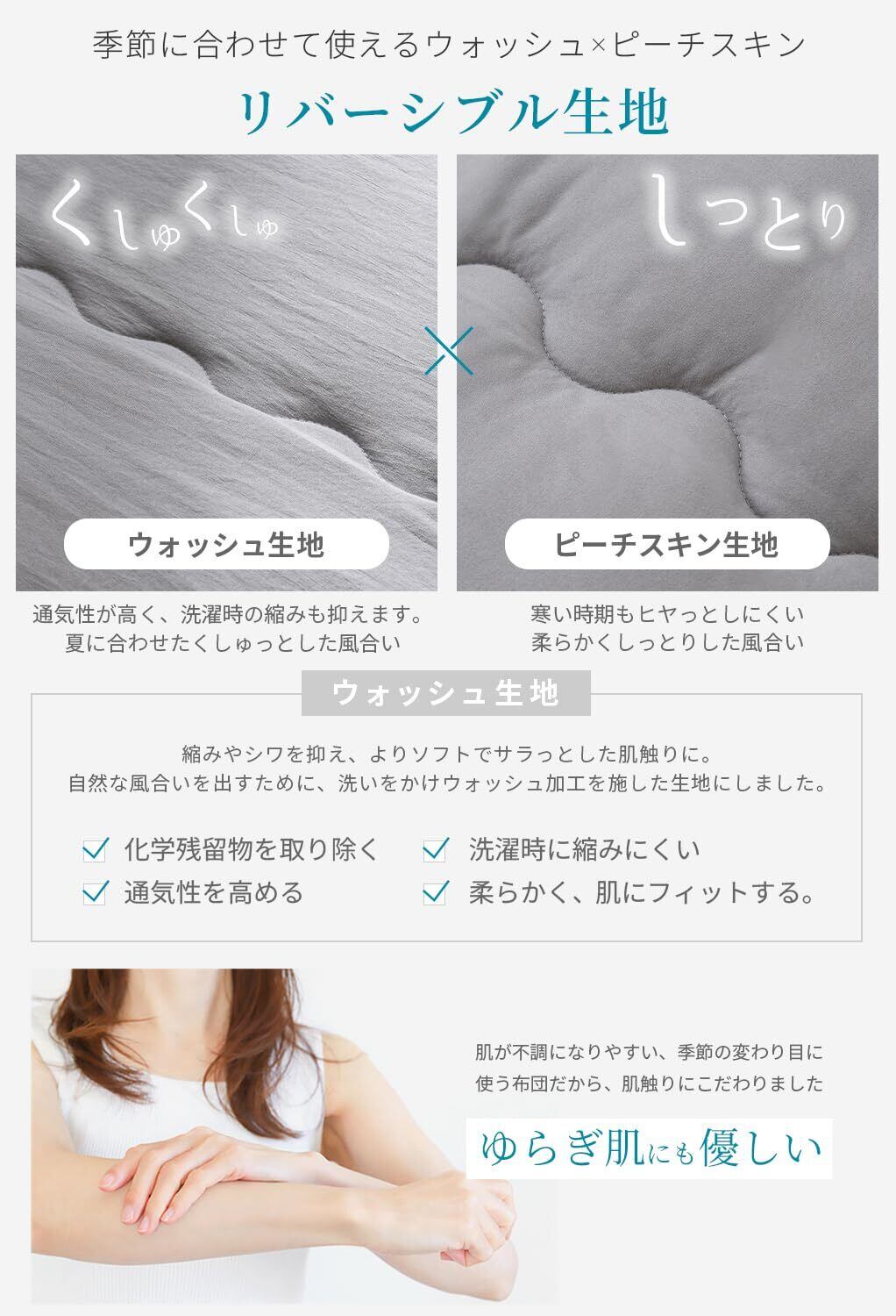【柔らかな肌触り】ピーチスキン加工を表生地に施し、柔らかく滑らかな肌触りに。ほこりが出にくい、綿切れしにくい、中空ポリエステル綿を使用。