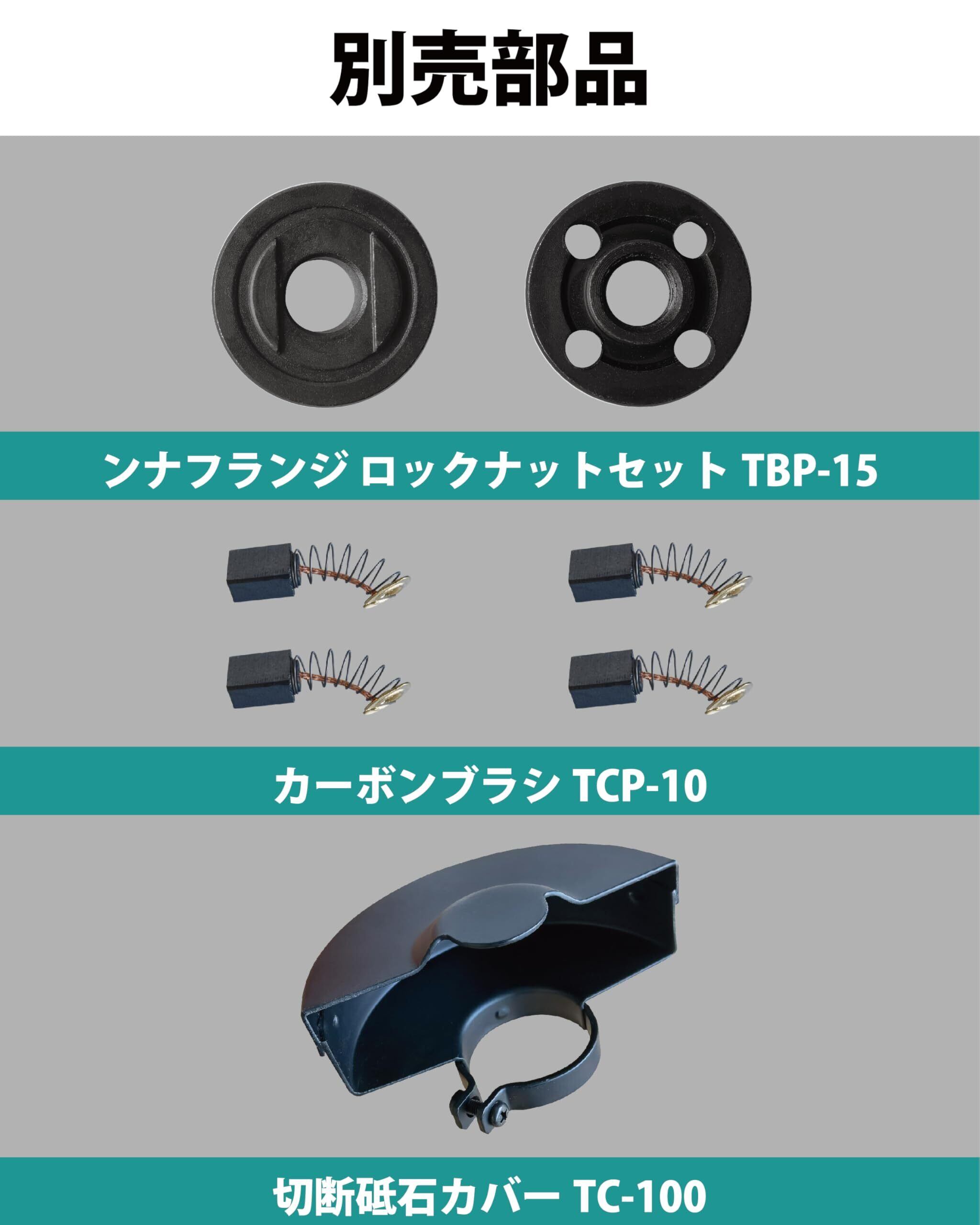 オプションの販売部品:カーボンブラシTCP-10。切断砥石カバーTC-100。ンナフランジ ロックナットセットTBP-15(本体はすでに1セット付属している)。