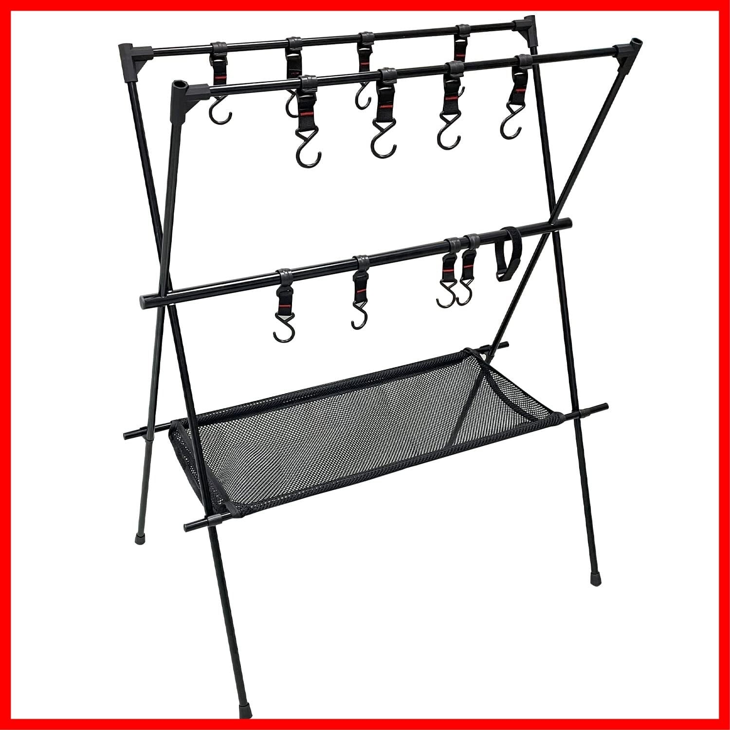 Sutekus キャンプラック ランタンスタンド ハンギング アウトドア ランタンハンガー 掛けフック8個 幅73センチ 高さ90センチ 収納用 ハンガー 物干し ネット 折り畳み 組み立て簡単 キッチン道具 整理 家庭用 登山 アウトドア キャンプ テント泊 アルミ合金 収納袋付き | hananoki