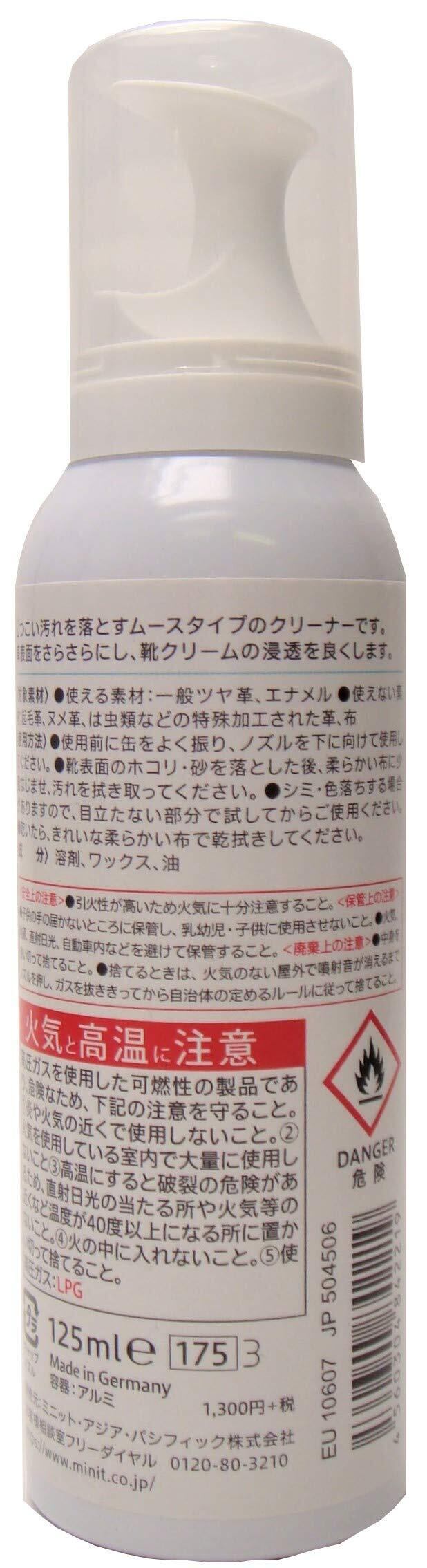 【特長】革のしつこい汚れを落とすムースタイプのクリーナーです。キメ細かな泡がこびりついた古いクリームやワックスの汚れを包み込んで落とし、新たに塗るクリームの下地づくりをします。一般ツヤ革・エナメル用【使用方法】・使用前に缶をよく振り、ノズルを下に向けて使用してください。・靴表面のホコリ・砂を落とした後、柔らかい布に少量なじませ、汚れを拭き取ってください。・乾いたら、きれいな柔らかい布で乾拭きしてください。