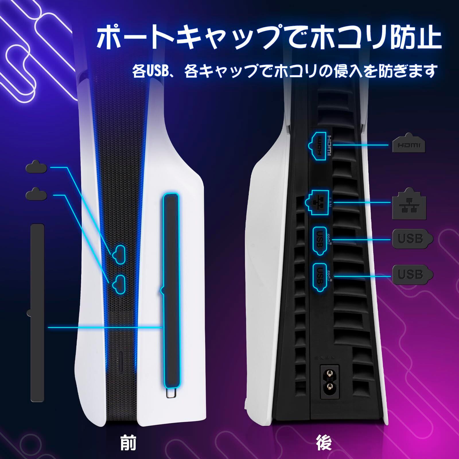 包括的なポートカバー: USB、HDMI、LANなどの外部ポートをほこりやごみから保護するための追加のポートカバーが付属しており、コンソールの接続を清潔に保ち、正常に機能させます。