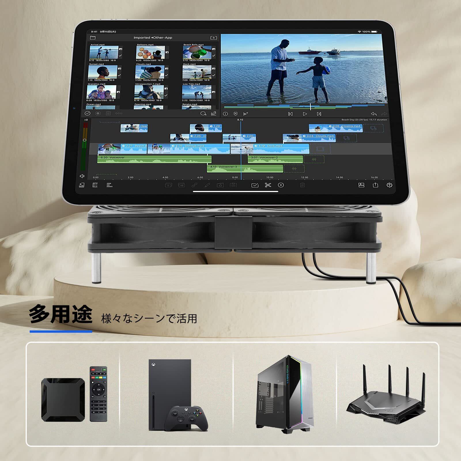 電子端末をUSB 冷却ファンに乗せて、風が下部(上部)から端末に当てるように冷却させます。空気の流れ又は熱気の排出を加速し、熱こもり現象を防ぐことができます。
