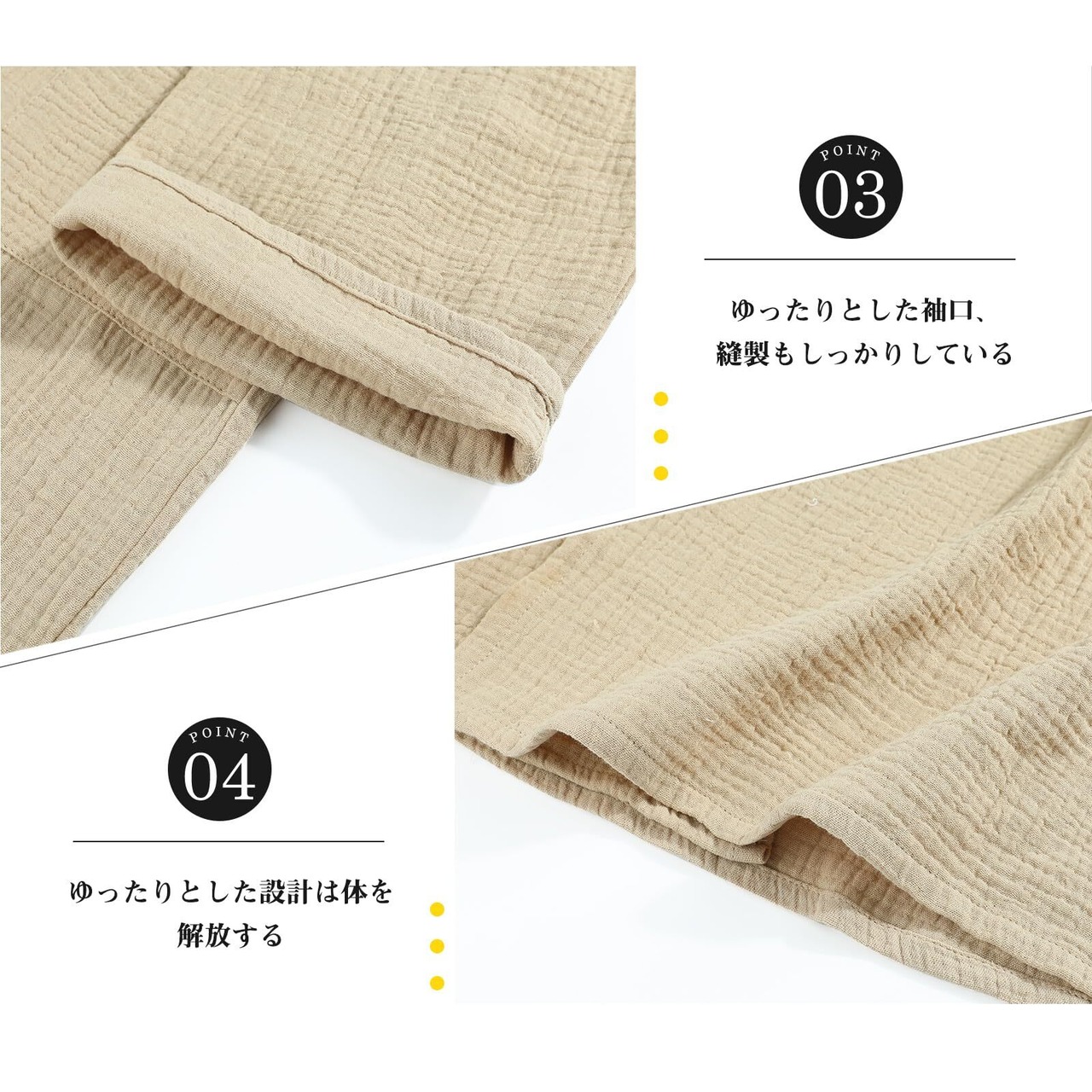 【シーン】しっかりした縫製で数次洗濯しても変形しない、夏は涼しい、春秋には着心地良い、オールシーズン着用可能。普段の寝巻き、ルームウェアとして、旅行等のお泊り用も役に立ちます。部屋、旅館、ホテル に適用されます。