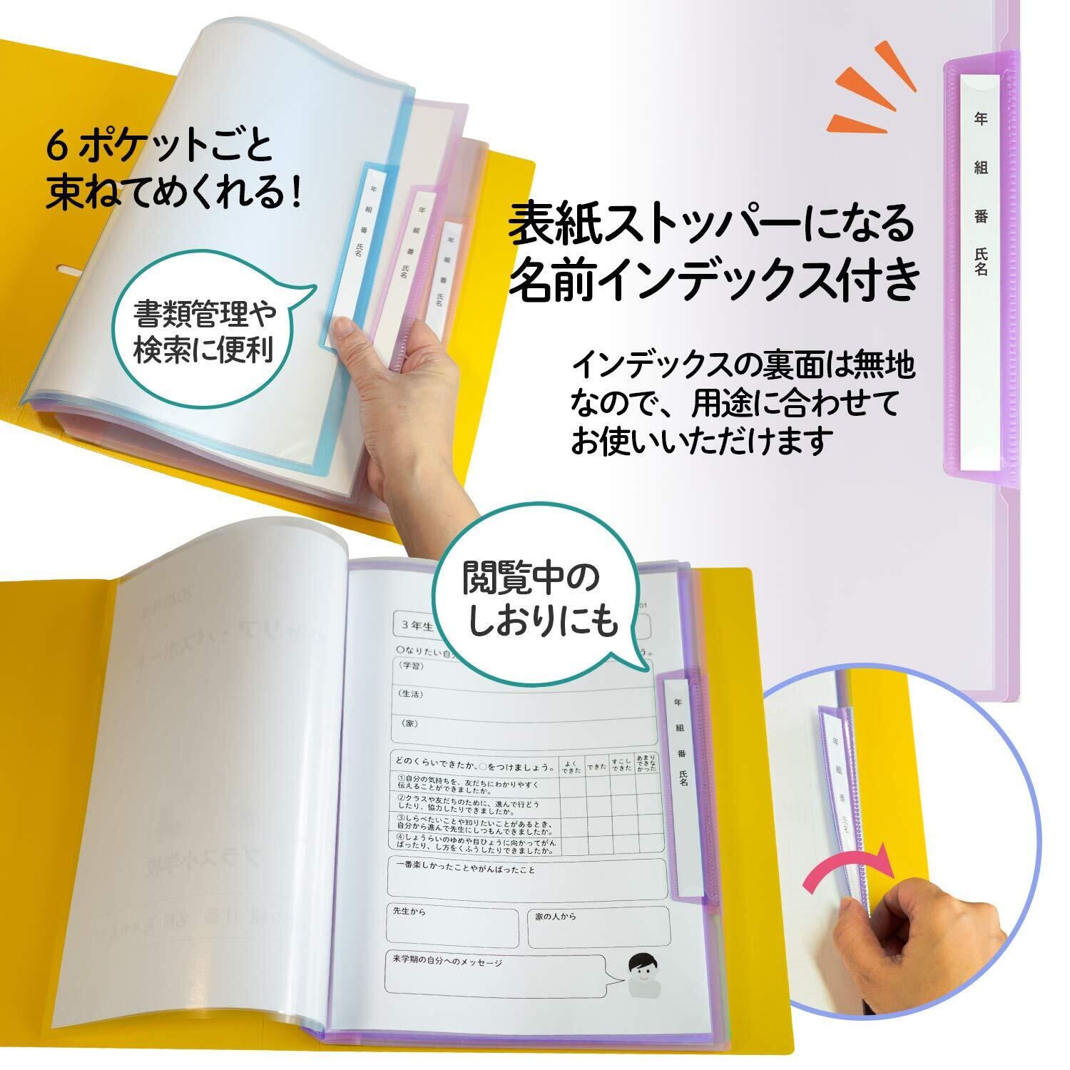 名前インデックスとして使える表紙ストッパー付き。生徒毎の書類管理や検索に便利。