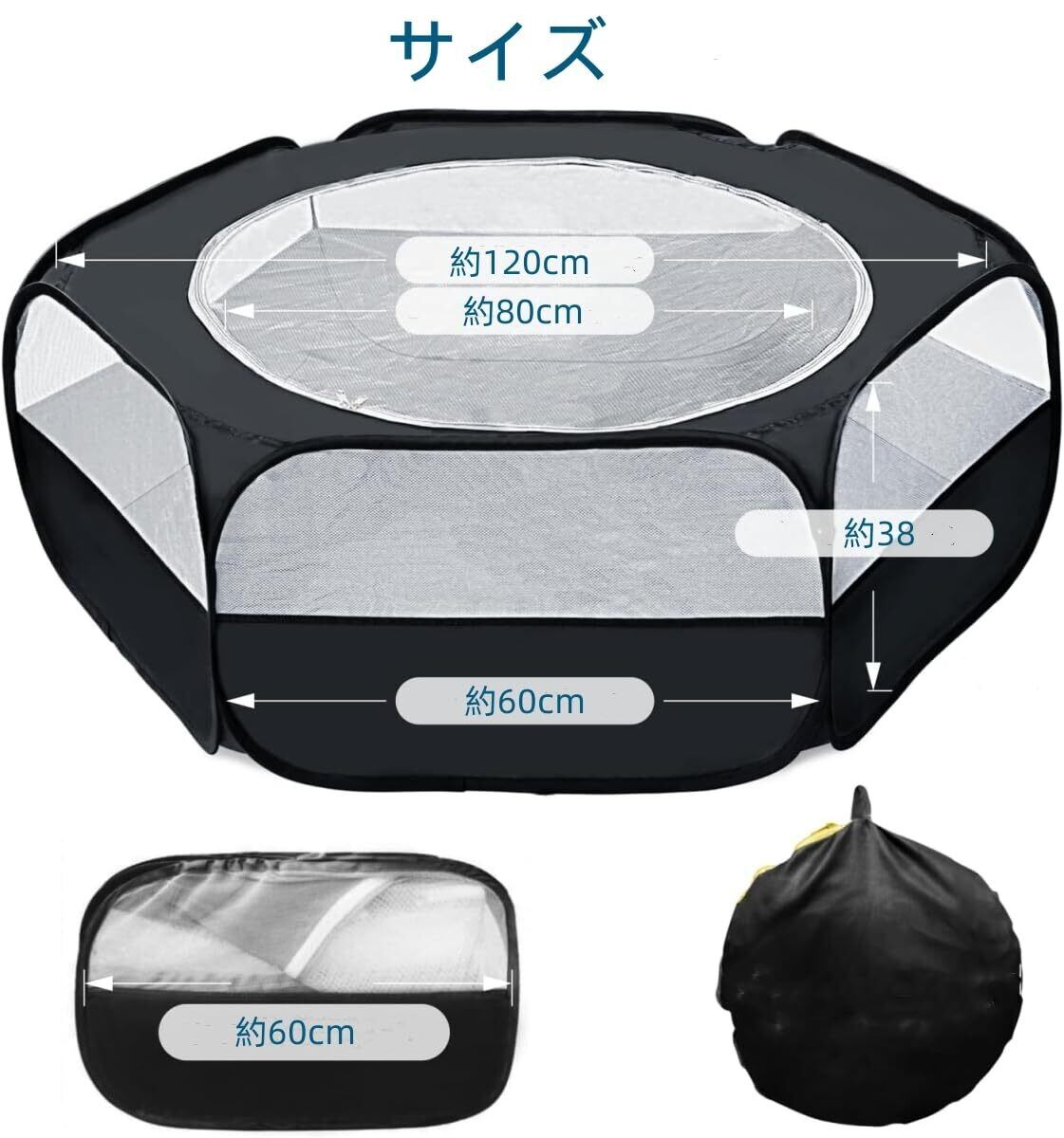 1.【製品仕様】ペットサークル本体+収納袋+固定棒3本付き、サイズ:[展開の時]約 120cm×38cm [収納の時] 約24×23×3cm、カラー:ブラック、素材:オックスフォード布+メッシュ素材。