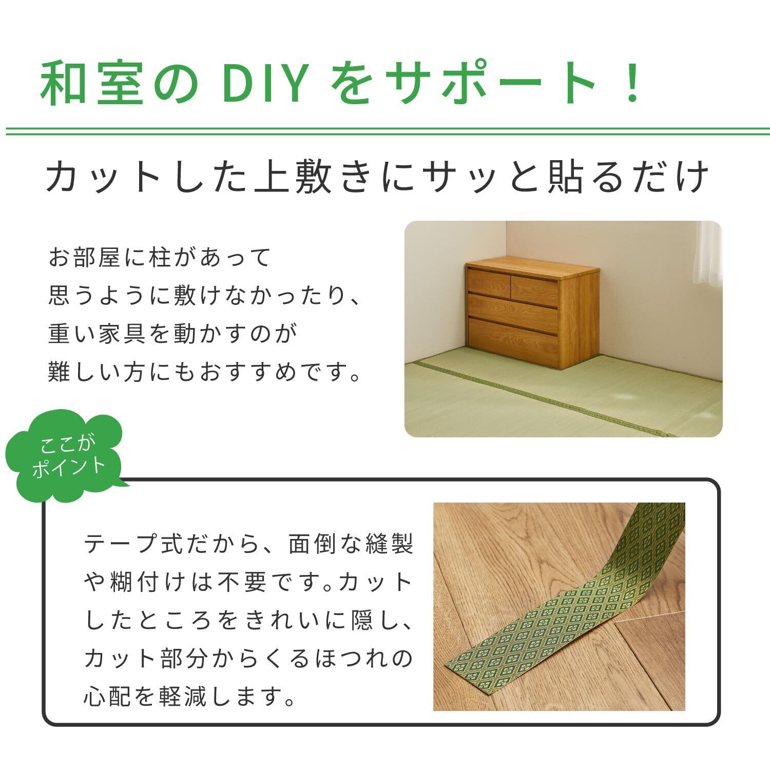 フリーカットできる上敷きを使って、柱や移動が大変な重い家具などがある部屋にも、縁を補修して綺麗にぴったり敷き詰めることができます。