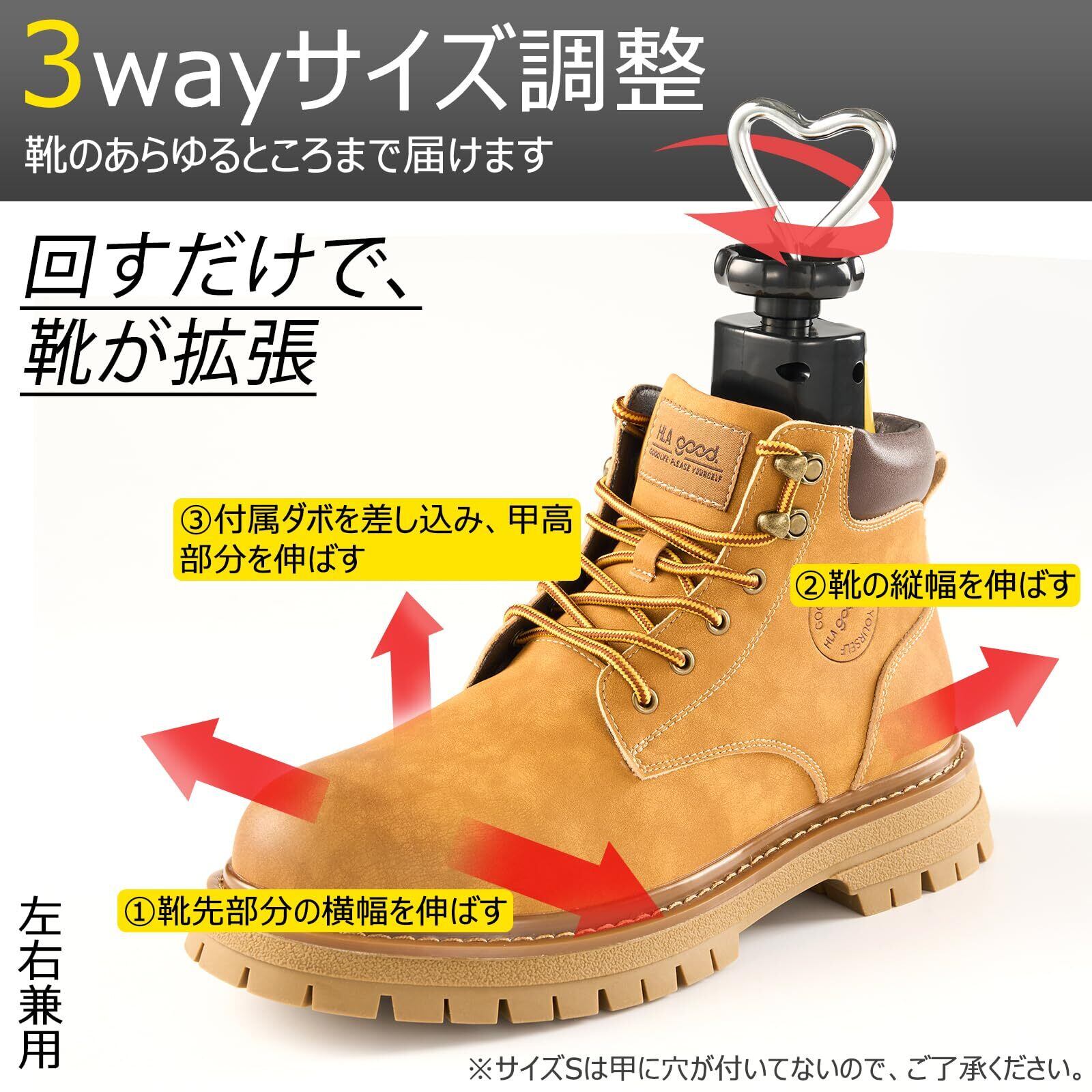 【強化版のシューズストレッチャー】普通版のシューズストレッチャーより、多くの靴に対応できるようになり、足の形により近く、履き口の高い靴にもきちんと合わせられ、横幅、縦幅の拡張機能を十分に活かせる。安全靴、登山靴、作業靴、ミドルカット、ハイカットのスニーカーなど、様々な靴に対応。 *(このシューツリーは長靴には適していません)*