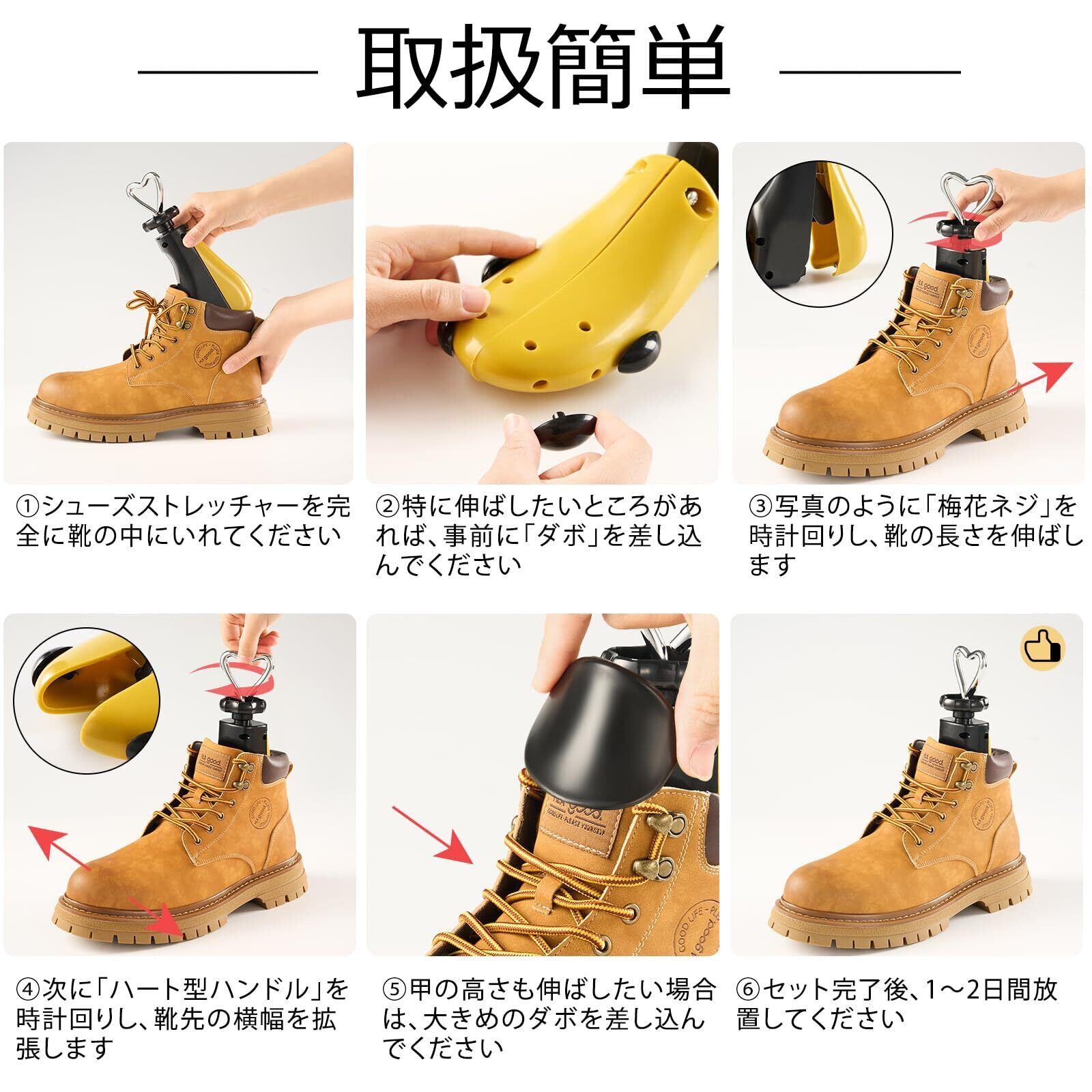 【横幅、縦幅、甲高を伸ばす】ブーツ用に対した強化、かかとやつま先がイタイっ、キツイっなどの悩みで困っている方は、このシューズストレッチャーを使えば安心できます!簡単に扱い可能、靴の縦幅、つま先幅、甲高を自由自在に調整し伸ばすことができ、自分の足にフィットしたサイズに整えます。