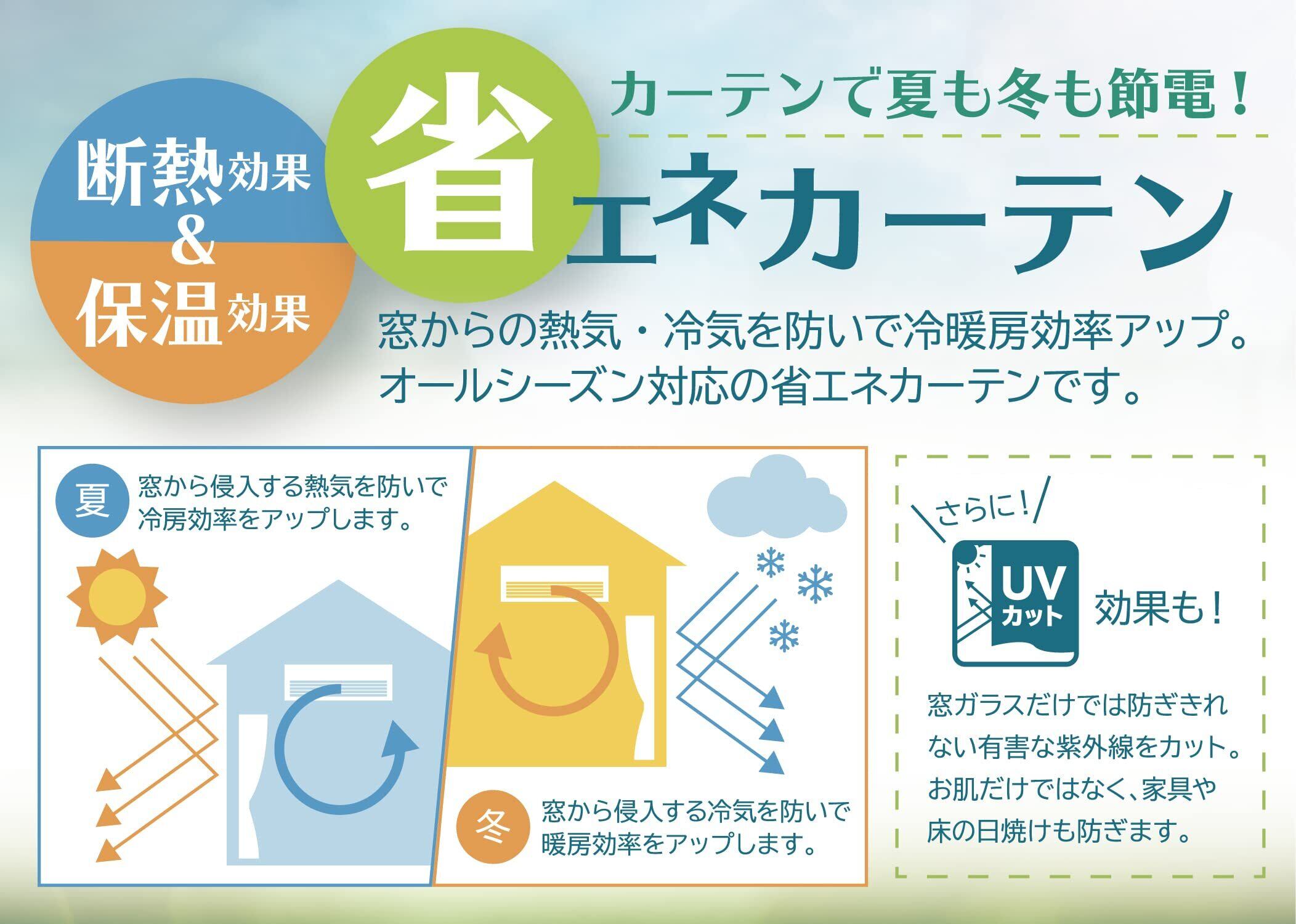 【省エネ】高密度の生地構造により、断熱・保温性能があります。夏は外の熱気の侵入を、冬は外の冷気の侵入を防ぎ、冷暖房効率を高めます。