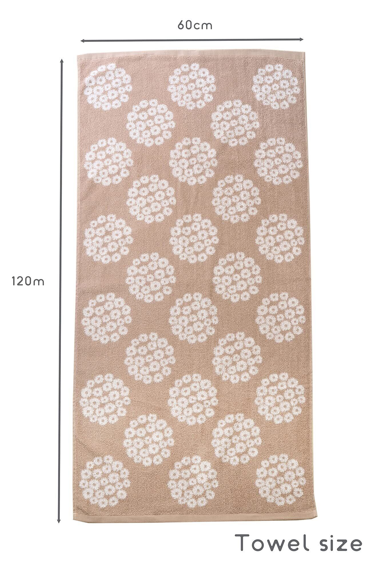 「花束」をモチーフにつくられたデザイン。少しくすんだ色合いが優しいイメージとぴったりです。普通の糸より、撚りが甘いあま撚り糸を使った、ふんわりと肌触りのやさしいタオルです。