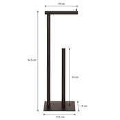 【製品仕様】トイレットペーパースタンドは全体の高さは54cm、ロールペーパーを収納する垂直ポールの高さは33cm、合計4ロール収納可能、製品の具体的な寸法は詳細画像で確認できます。