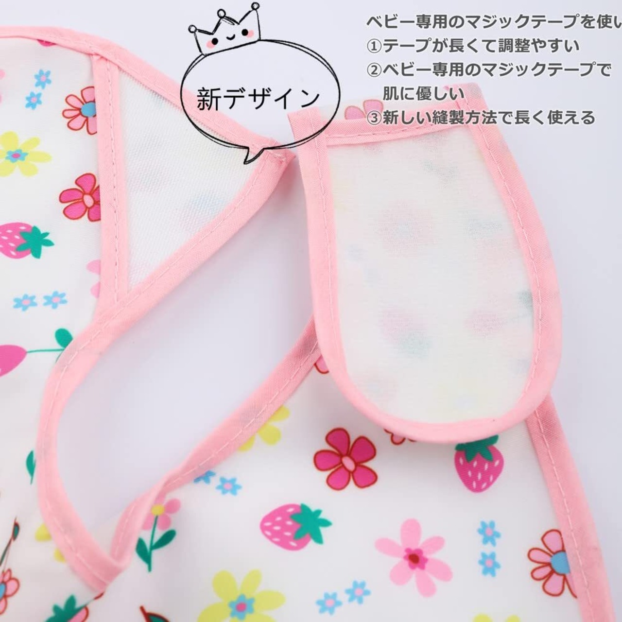 成長に合わせる食事用スタイ:後ろに子供専用の長いマジックテープをついてでサイズ調整ができる。子供自分でも簡単に撮れないです。対応年齢:0~4歳